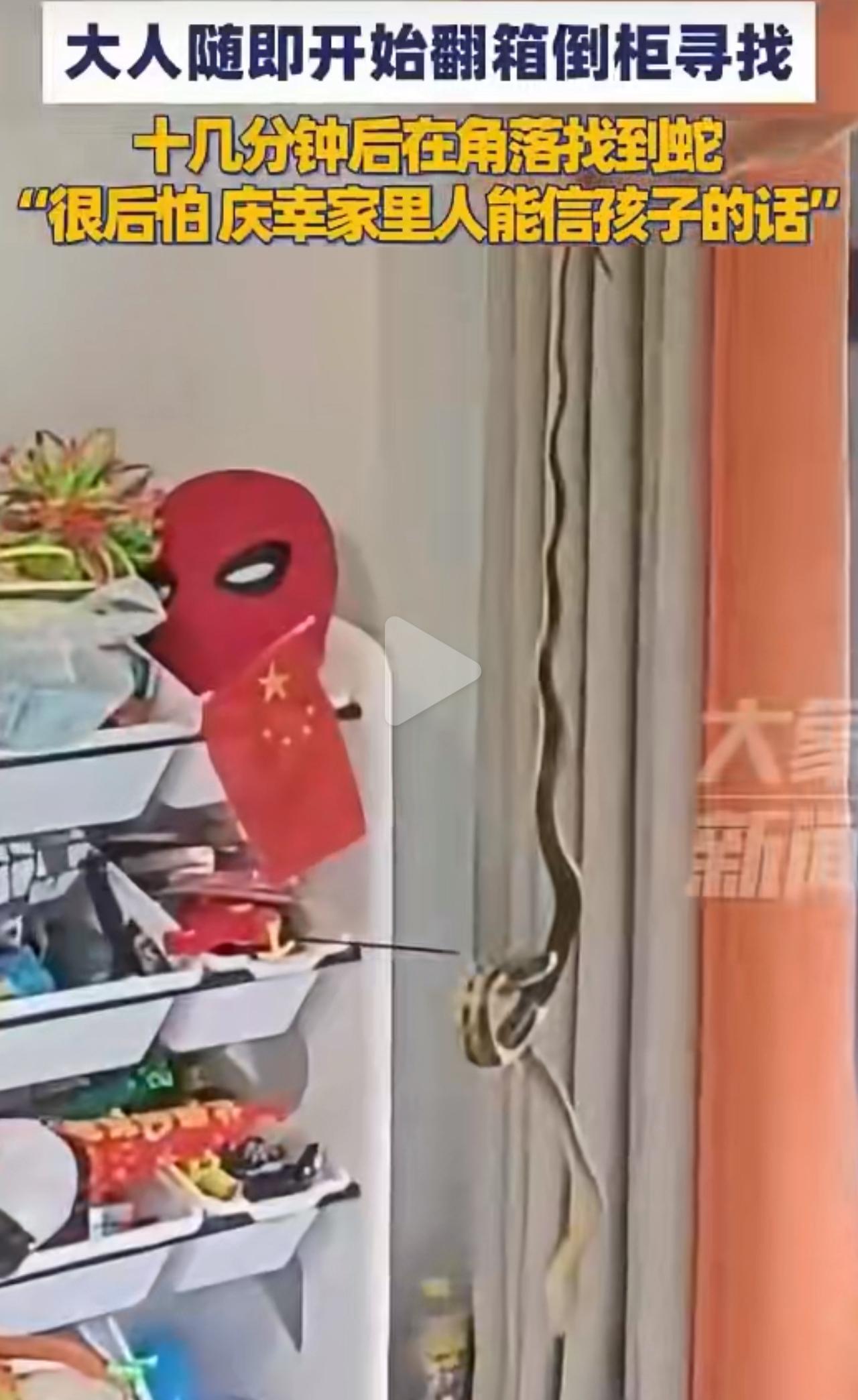 5岁娃喊“屋里有蛇”,全家翻箱倒柜10分钟,还真从沙发底拽出来了! 四川自贡这事儿,现在想起来都觉得庆幸——5岁小男孩正玩着呢,突然嚷嚷“屋里有蛇”,家里人没当他瞎起哄。虽说姐姐嘀咕“每月都叫保洁打扫,哪来的蛇”,半信半疑的,但姨公姨婆二话不说,立马动手挪沙发、翻柜子找。 折腾10多分钟,还真在沙发底下揪出条蛇!你琢磨琢磨那孩子当时啥心情?一开始说不定怕大人说他骗人,没敢大声说,见全家都正经八百地帮着找,肯定又紧张又踏实。后来他爸说“想想都后怕”,要是当时没人信娃的话,夜里蛇钻出来乱爬,那后果可真不敢想。 好多网友都晒自家类似的事儿:有的娃说“插座电手”,被家长骂“别瞎碰东西”,结果后来真查出插座漏电;有的说“柜子后面有怪响”,被当成瞎胡闹,最后发现是老鼠在咬电线。专家都讲,小孩对身边的变化比大人敏感多了,他们那些碎碎念的“小事儿”,往往藏着真危险。 这哪儿是“运气好”啊,分明是家人信娃的话,才没出岔子。现在正是蛇活跃的时候,家里要是在老小区或者离山近,多留意犄角旮旯。真撞见蛇别自己上手抓,赶紧打119叫人来。最要紧的是,别嫌娃话多,好好听他们说的每句“小嘀咕”,说不定那就是在给全家报平安警呢!小童蛇 家里进蛇有什么寓意
