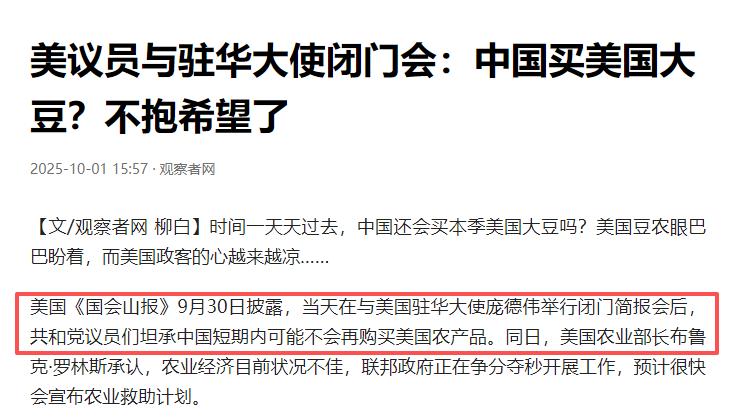 外媒:美国议员在听取美国驻华大使珀杜的闭门简报后表示,中国短期内不会恢复购买美国农产品。 这不得不提到关税这层关键问题,美国之前单方面给中国输美的商品加了高关税,中国自然也得采取反制措施,给美国大豆这些农产品加了税,这一下就让美国农产品彻底失去了价格优势。 因为美国先挑了头,2025 年 3 月,美国以芬太尼为由对所有中国输美商品加征 10% 关税,这种不讲道理的单方面举动直接触发了连锁反应。 中国很快就出台反制措施,3 月 10 日起就对美国大豆、高粱等农产品加征 10% 关税,鸡肉、玉米这些则加征 15% 关税,就是要让美国知道贸易战没有赢家。 紧接着,美国不仅没反思,反而变本加厉,一个月后又把对华 “对等关税” 从 34% 提至 84%,中国只能跟着调整应对,毕竟咱们也不能白白吃亏。 关税一涨,美国农产品的价格立马就没法看了,就拿大豆来说,2025 年上半年中国进口大豆均价里,巴西大豆才 439.1 美元一吨,美国大豆却要 459.8 美元一吨,每吨贵出 21 美元,换成谁买东西都得挑便宜的不是? 更关键的是,中国早就不是只能靠美国买农产品的情况了。以前美国大豆占中国进口的大头,可现在巴西大豆已经成了主力,2024 年底的时候,中国进口大豆里巴西的占比都到 70% 了,美国的只剩 20% 左右。 2025 年 5 月之后更夸张,海关总署的数据里干脆没了美国大豆的影子,连续好几个月进口量都是零,太平洋上连艘运美豆来中国的船都没有。 玉米那边的情况也差不多,美国以前还能占中国玉米进口的七成多,可到 2024 年,中国从美国进口的玉米才 207 万多吨,只占进口总量的 15%,剩下的八成多都来自巴西和乌克兰。 猪肉就更不用提了,2024 年中国从美国进口的猪肉才 7.3 万吨,只占总进口量的 6.8%,对咱们国内猪肉供应几乎没影响,毕竟咱们自己的猪肉早就够吃了。 美国农民这下可遭了罪,美国大豆协会自己都承认,中国需求占了美国大豆出口市场的 60%,想找第二个这么大的市场根本不可能。 2025 年 4 月那一周,中国一下子就削减了 1.2 万吨美国猪肉采购计划,当周销量跌到只剩 5800 吨,比前一周少了 72%,芝加哥的猪肉期货都跟着跌了。美国 2024 年大豆产量高达 1.2 亿吨,中国不买了,这些豆子只能堆在仓库里,产能严重过剩。 而且咱们中国自己也在想办法,国产大豆产量越来越高,2023 年都突破 2000 万吨了,能替代一部分美国大豆。 饲料里也在搞减量替代,以前豆粕占比 17%,现在加些杂粕和氨基酸,能降到 11%,一年能少用 1100 万吨豆粕,这相当于美国对华年出口量的三成呢。 说到底,中国短期内不恢复买美国农产品,根本不是故意刁难,而是美国自己的关税政策把路走死了。咱们有便宜的替代来源,国内产量也在涨,自然没必要花冤枉钱。可美国农民却成了政策的牺牲品,明明有好豆子好猪肉,却卖不出去。 这种靠加关税搞贸易保护的做法,最后伤到的其实是自己人。不知道美国啥时候能想明白,贸易合作得讲对等讲诚信,光靠单方面施压根本没用。 大家觉得美国会先取消不合理关税吗?美国农民还能等到中国的订单吗?欢迎在评论区留言讨论!