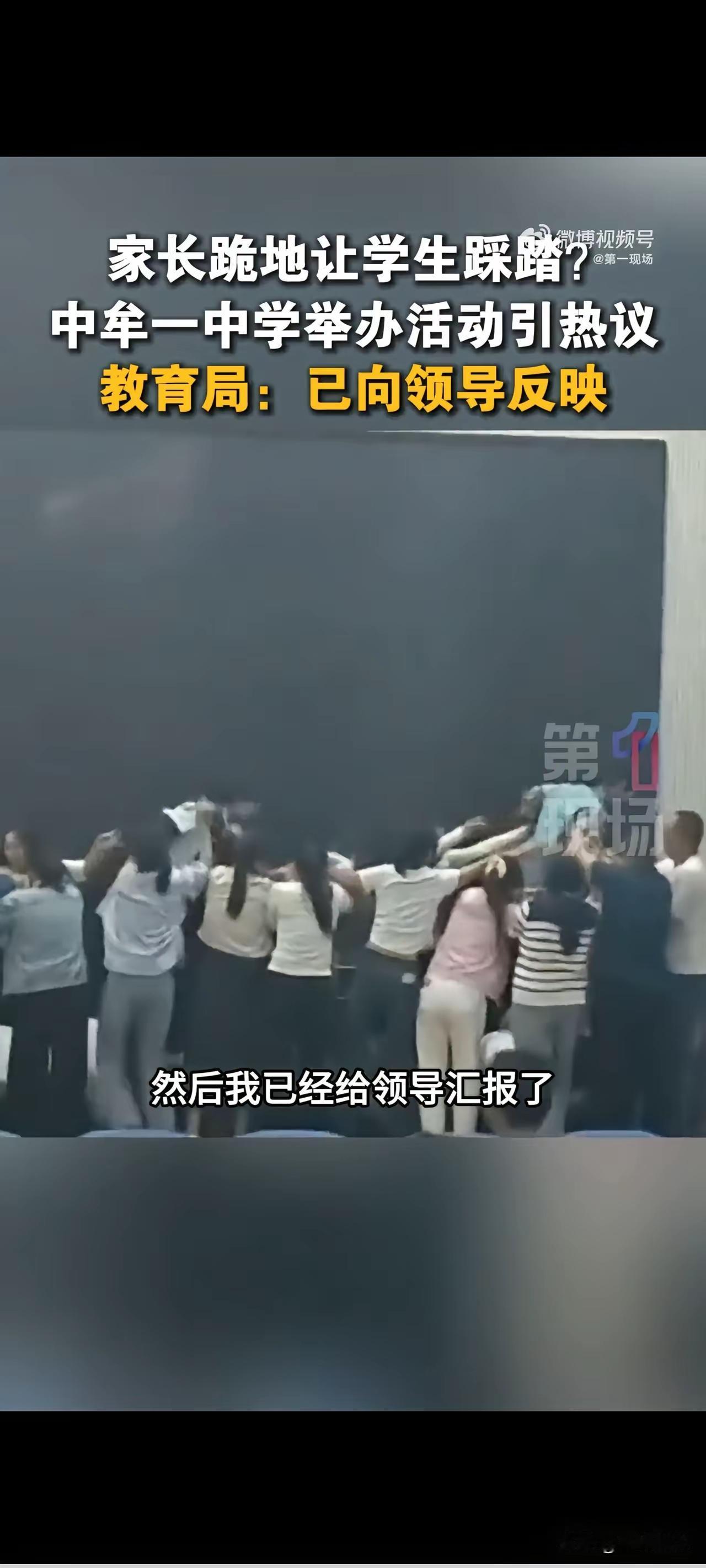 跪式感恩教育出现了! 10月6号下午,河南郑州中牟县一所中学的事儿在网上炸锅了。据说学校搞活动的时候,安排好多家长跪地,还让学生从家长身上挨个踩过去。 有网友说,这个活动是某领导策划的,曾在两三年前就做过一次类似活动(当时踩的是自己班同学,让同学趴在地上踩)! 学校解释,通过这样的教育引起学生的感恩家长之情,只是,形式不恰当! 讨厌家校共育活动,就好像不上学之前,家长不教育一样,就学校啥都懂。 这种传销爱用的成功学培训为啥给学生用啊,这种虽然有催动情感效果,但是 群体性服从性训练 ,对孩子独立身心不好,而且这种催动效果也仅限于现场有用! 以前说跪天跪地跪父母,现在还要跪小孩,明年要是爷爷奶奶来参加活动,是不是要跪孙子? 学校教育 中式愧疚教育 学生下跪 反讨好教育
