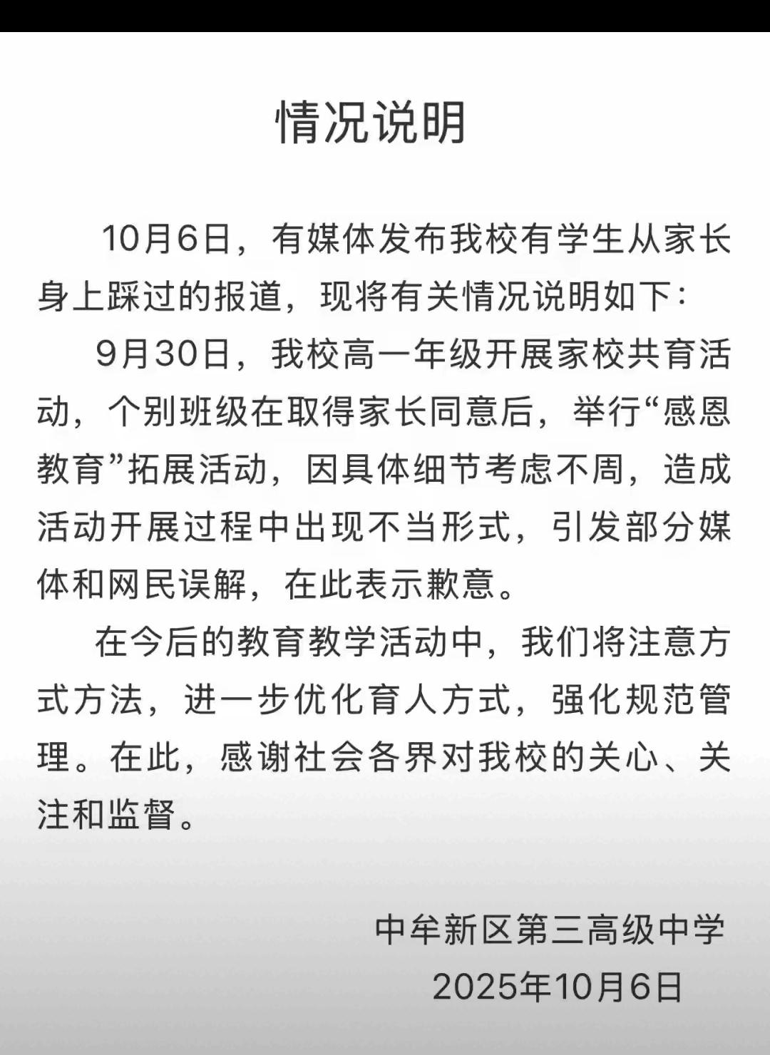 家长跪成一排被蒙眼学生踩背!这哪是“愧疚教育”,分明是拿尊严当教具,看着都让人心里发堵! 郑州这所中学的活动太离谱了,学生蒙着眼不知道踩的是父母,摘眼罩发现时当场哭了——这哪是震撼心灵,明明是戳心窝子。学校凌晨致歉说“考虑不周”,教育局也说活动欠妥,可一句轻飘飘的道歉,能抹掉家长跪地的尴尬吗? 更讽刺的是,有毕业生说以前是学生趴地上,现在换成家长,这哪是教育创新,简直是变着法折腾人。教育的核心是尊重,不是靠践踏尊严来“催泪”,真要教感恩,不如让孩子帮家长洗次碗、聊次天,比这种形式主义强一百倍。 你们觉得这种“愧疚教育”真能教出感恩吗?要是换成你,能接受这样的活动不?