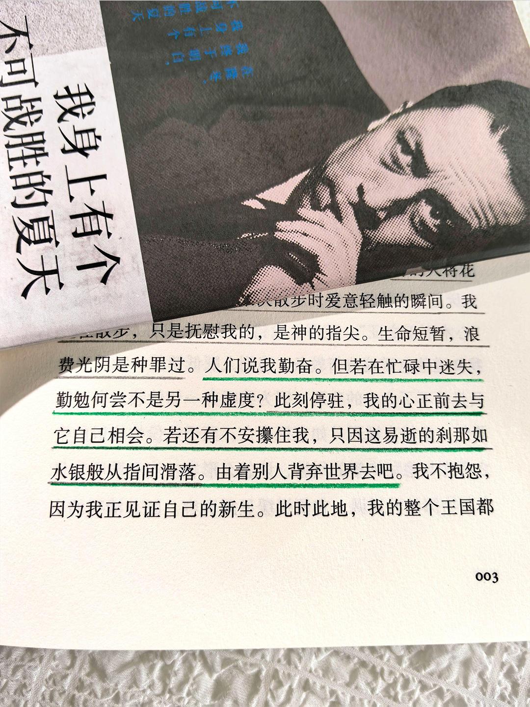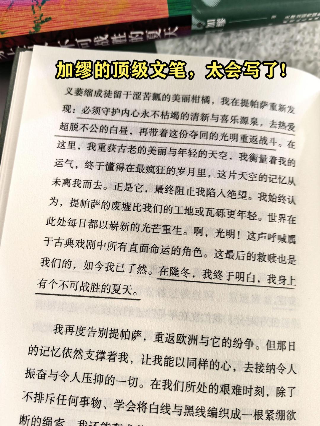 加缪24岁写下的人生之书。我共鸣到灵魂震颤!诺奖作品《我身上有个不可战胜的夏天》,一本相见恨晚的命运之书,他写的“夏天”,不是外在的温暖,而是一种不被摧毁的精神火种。我们被工作、学业、情感推着走,少年心气逐渐被磨灭,加缪用文字鼓励我们:带着创伤活下去,本身就是一种反抗,心里还有一块不被冻住的地方,那就是不可战胜的夏天。