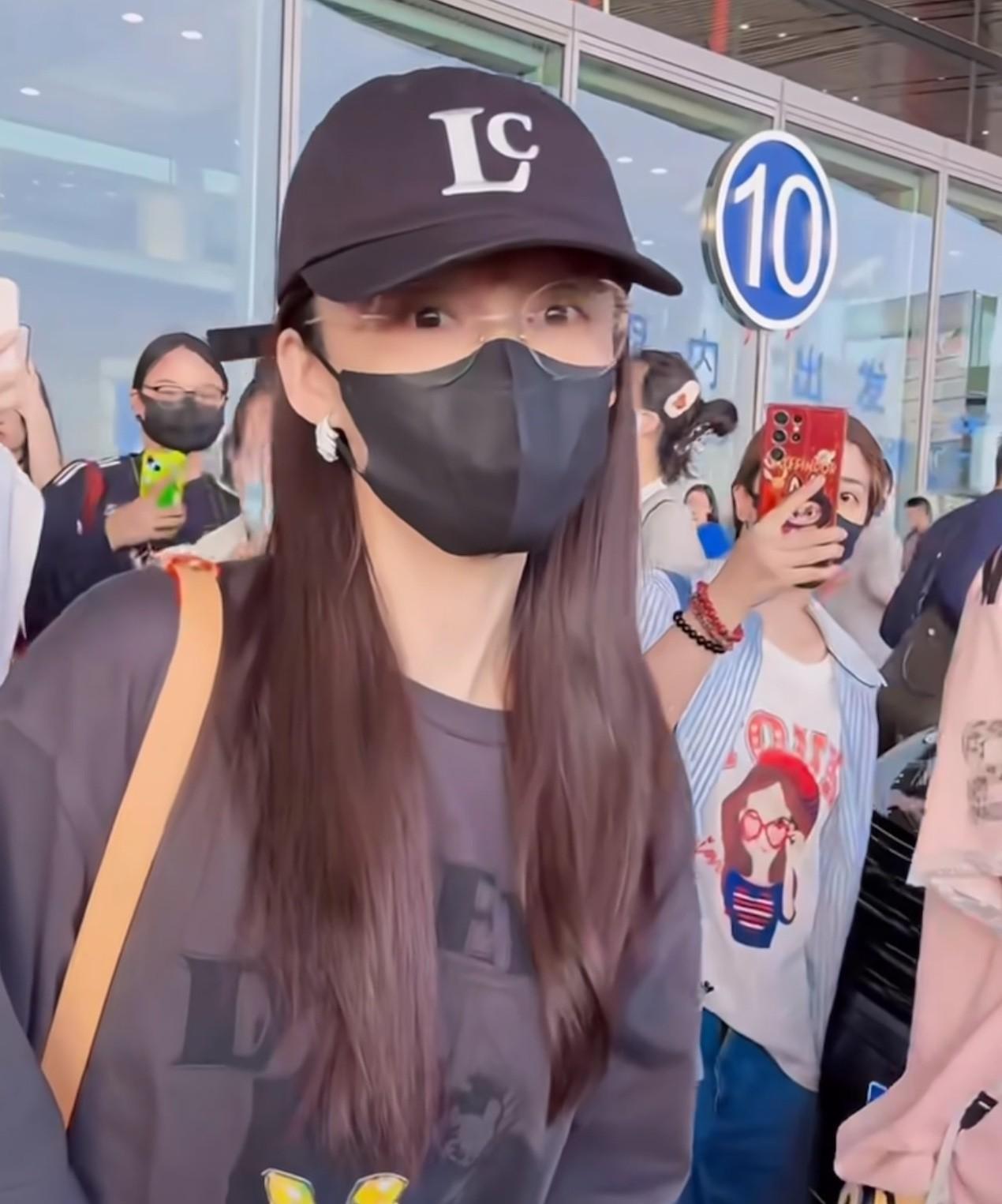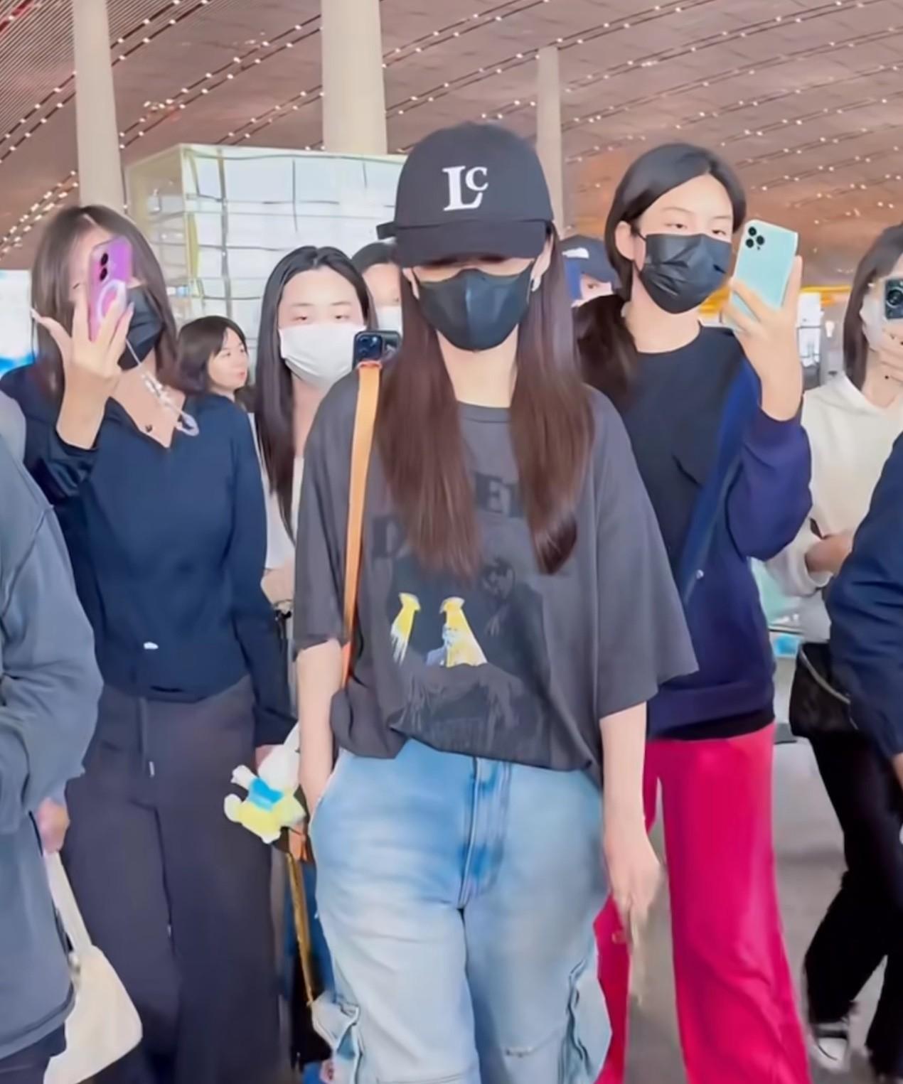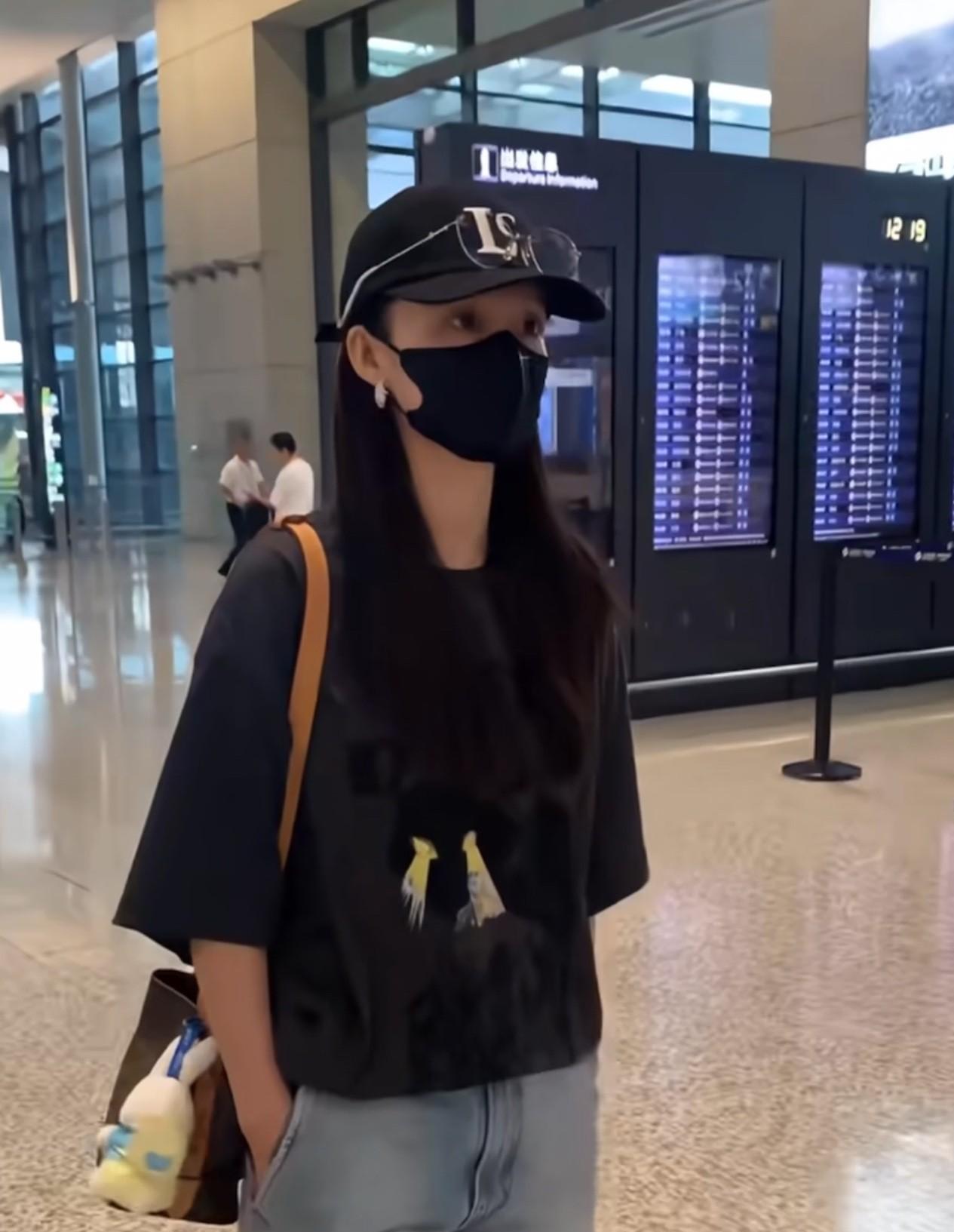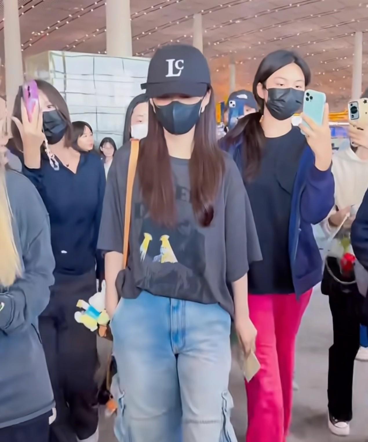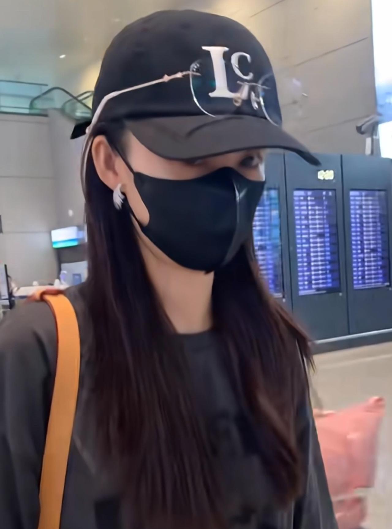 李沁今天穿得像个男孩,好酷~ 李沁机场到达,今天穿黑色T恤搭配牛仔裤,整个造型酷
