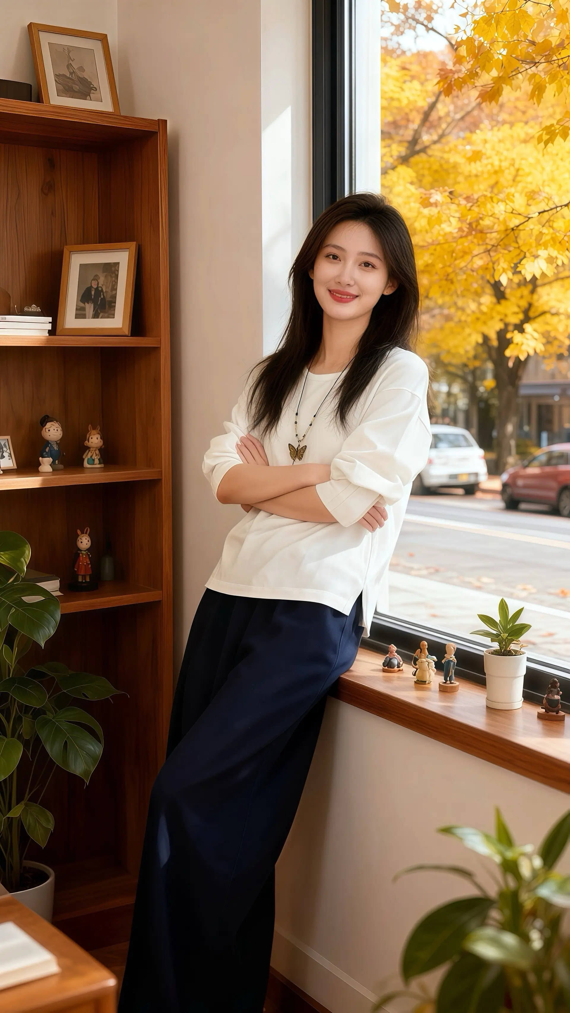 这套白色上衣和深蓝色阔腿裤的搭配,简约又舒适,让我在这个慵懒的午后倍感放松。我站起身,走到窗边,看着街上行人匆匆的身影,突然觉得这样的慢生活格外珍贵。于是,我决定给自己放个假,关掉手机,泡上一杯热茶,让自己沉浸在这份宁静中。