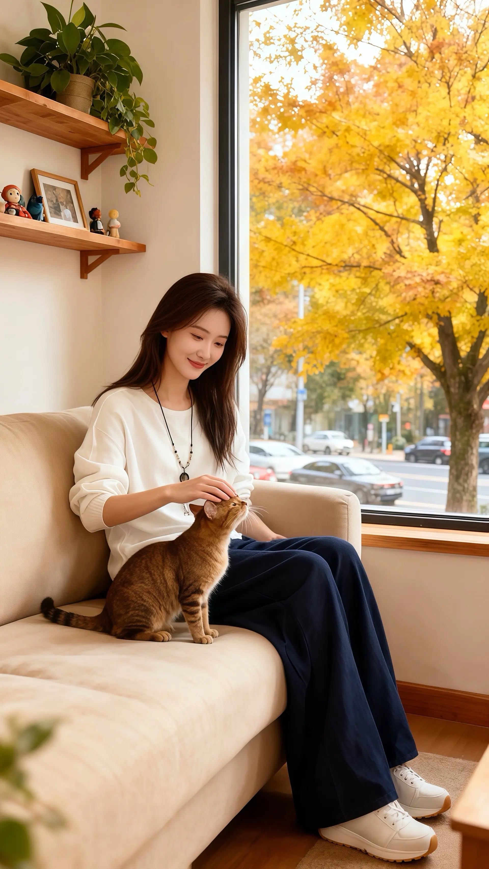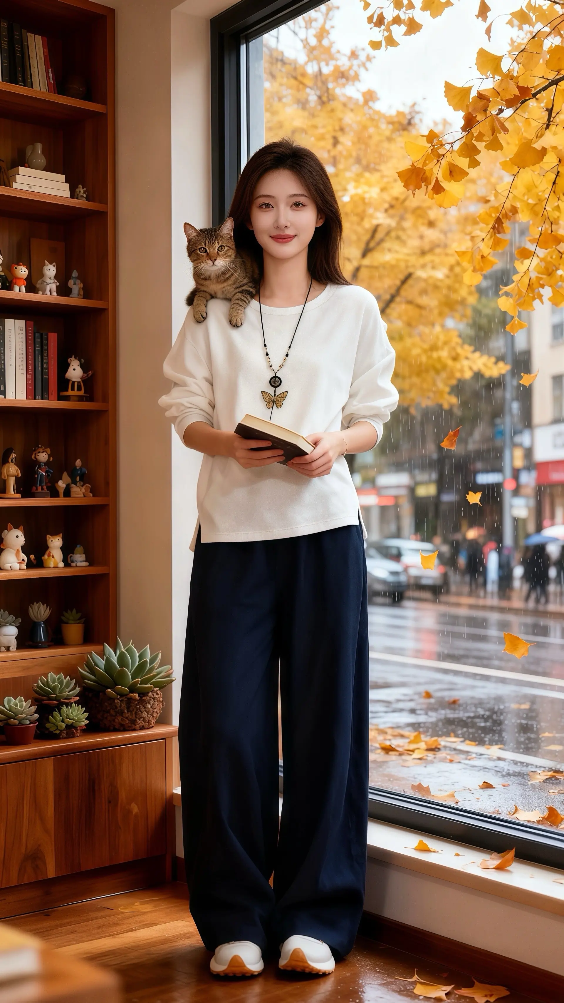 猫咪突然跳上窗台,好奇地看着外面飘落的黄叶。我笑着抱起它,走到书架旁,挑选了一本喜欢的诗集。阳光、猫咪、好书,还有这套让我感到自在的衣服,构成了这个秋日里最美好的画面。