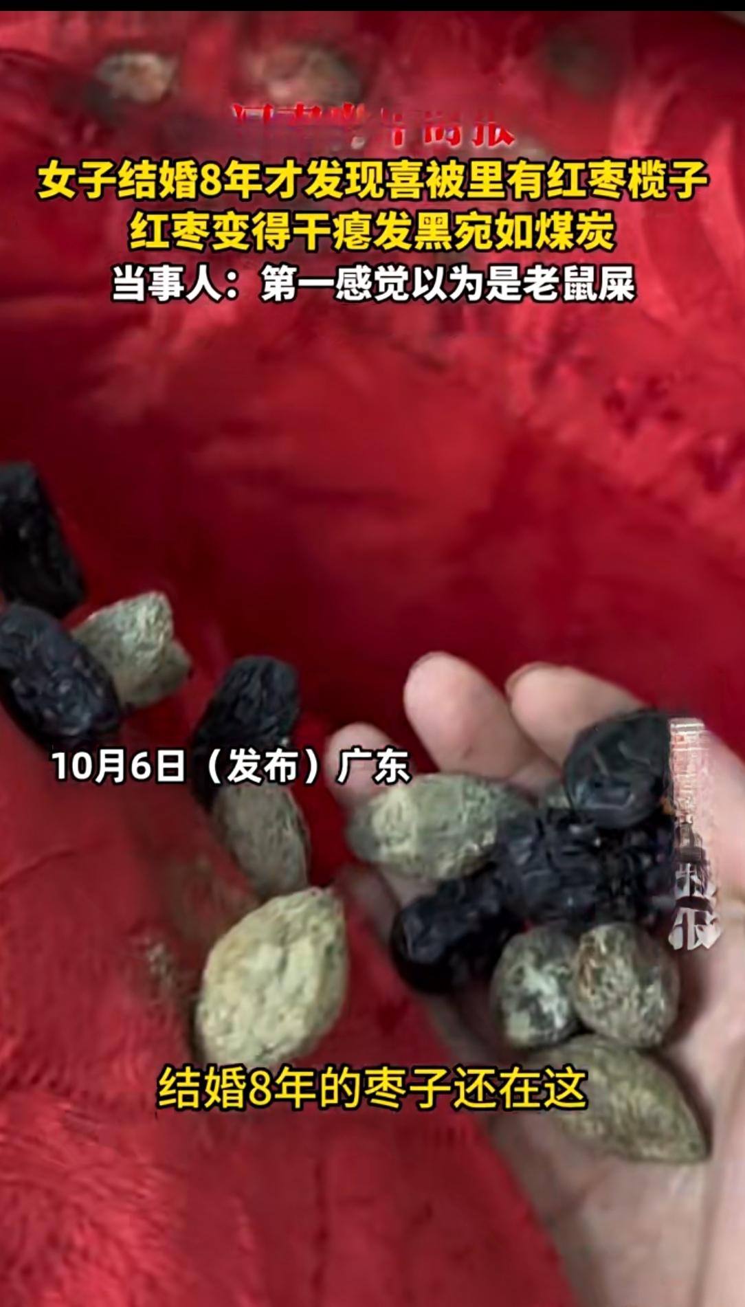 结婚8年拆喜被,掏出“黑煤球”?原是藏了8年的祝福 10月6日河南一女子拆洗结婚喜被,伸手一摸被芯里硬邦邦,掏出来的东西吓她一跳——黑黢黢、干巴巴的小球,第一反应还以为是老鼠屎,凑近看才认出是红枣和榄子。 这“陈年惊喜”让她哭笑不得。结婚时按习俗铺了“早生贵子”的干果,以为早被收走了,没想到老妈早把这份祝福缝进了被芯。8年过去,红枣榄子失水缩成小球,颜色深如煤炭,捏起来硬邦邦,跟刚放进去时的饱满模样判若两物。 网友看了这幕全乐了,评论区秒变“晒陈年祝福大会”。有人说“我家婚被里的花生都发芽了,才翻出来”,还有人调侃“这祝福保质期比婚姻还长”,更有过来人支招“赶紧扔了,不然潮气重容易生虫”。 这事儿藏着老传统的门道。结婚放红枣、花生、桂圆、莲子,图“早生贵子”的好彩头,不少长辈会偷偷把干果缝进被芯,盼这份心意能扎根。但按老规矩,喜被刚结婚不能洗,说“洗了就没福气了”,这才让干果在被芯里“藏”了8年。 其实喜被清洗有讲究,婚后一两个月洗最合适,用中性洗涤剂温水洗,还能固色。这发黑的干果虽没法吃,却是长辈藏了8年的心意。最后提个醒:新婚后赶紧检查喜被,别让祝福在被芯里“过期”啦!你婚被里藏过啥惊喜?婚房婚喜被子 结婚喜被习俗 婚礼陪嫁喜被 婚喜糖盒 新婚喜被 作者声明:素材来源网络
