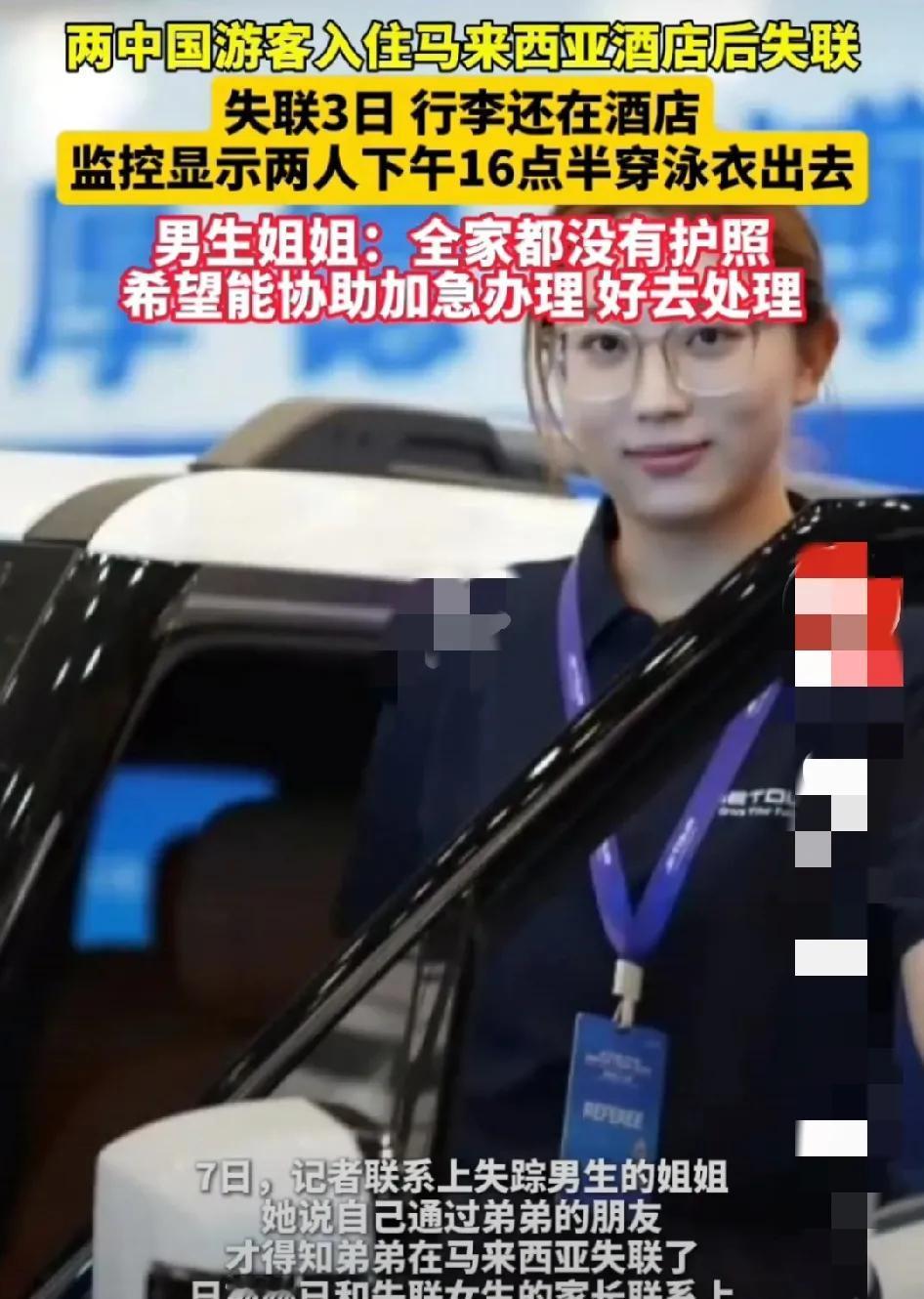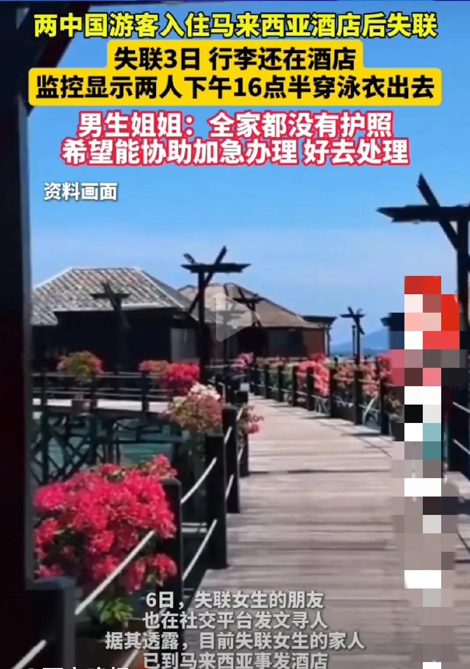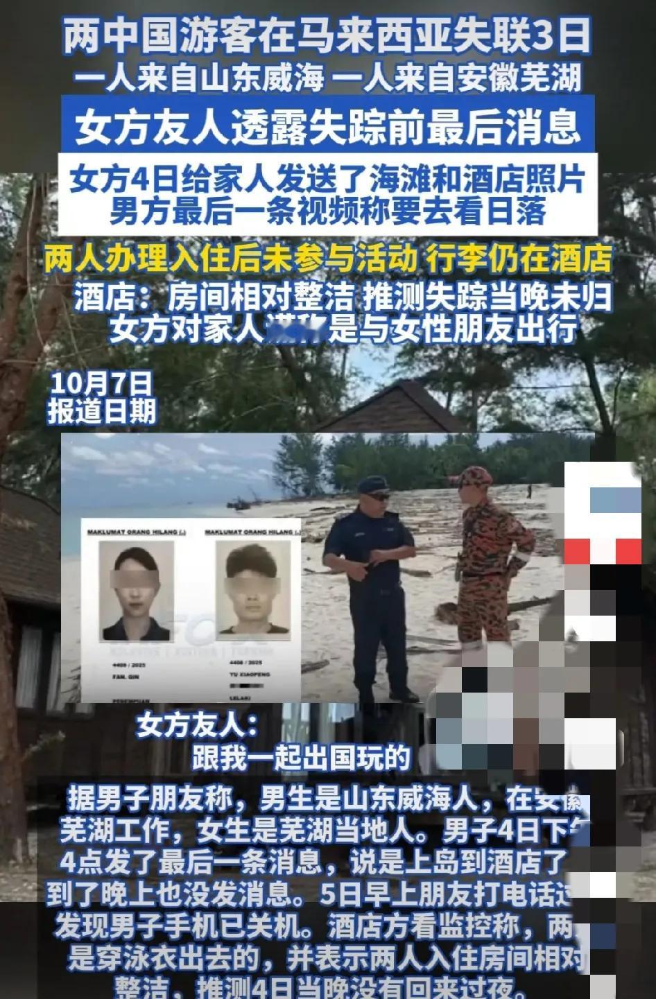 一对情侣,同命鸳鸯,同年同月同日失踪!但愿这对情侣能够平安归来!现在,去国外旅游的国人出事的太多,希望尽量注意安全,开开心心旅游,平平安安回家! 据报道,中国情侣在马来西亚沙巴州曼塔那尼岛的丝绸美人鱼度假村入住期间失踪,最后一次被目击时,男性游客于晓鹏身穿黑色长袖与长裤,女性游客范琴穿黑色短袖与短裤。两人原定10月5日退房,但4日下午入住后便失去联系。 据朋友张先生透露,于晓鹏在10月3日曾提及次日可能参与浮潜、看日落或玩桨板等活动,但具体行程未明确。4日下午4时,于晓鹏通过微信发送最后消息称“上岛到酒店了”,此后未再联系。 再有,张先生通过于晓鹏房间内的平板电脑定位功能发现,手机最后一次信号出现在海域深处;两只蓝牙耳机中,一只定位在市区,另一只停留在海上。 另外,当地警方于10月5日晚接报后,联合潜水人员、无人机、海警等55人展开搜救,重点区域为曼塔那尼岛陆地区域及周边海域。截至10月8日,仍未找到两人,因近期降雨导致海况不佳增加搜寻难度。