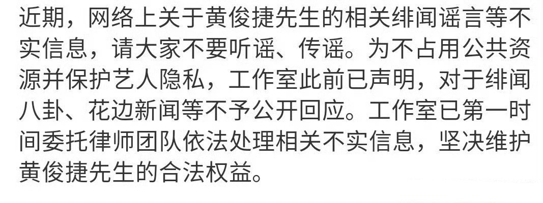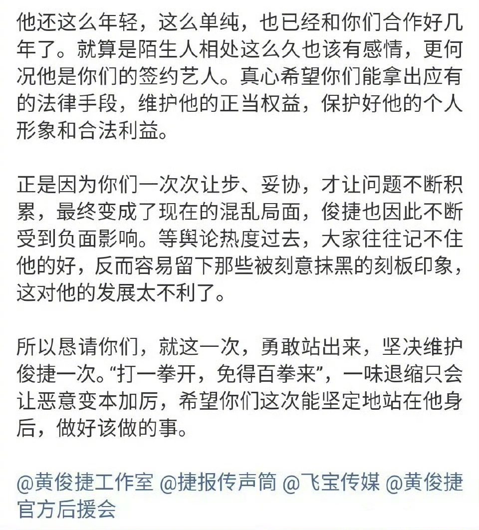 黄俊捷粉丝向工作室维权要求尽快告黑,要求维权。