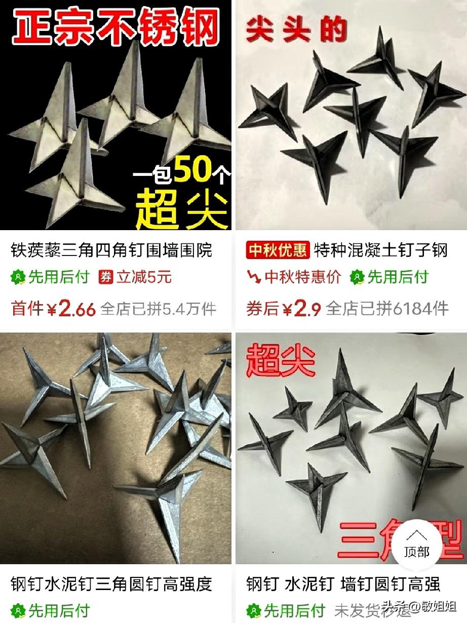 缺大德了!电商平台 这波操作真是让人火大! 三角钉这玩意儿,除了扎 轮胎搞破坏,还能有啥正经用途?可偏偏一搜电商平台,满屏都是“24小时保密发货”的承诺,这不是明摆着给坏人递刀子吗? 有网友说十年前超载怕查,这玩意儿能“派上用场”,可现在呢? 外卖小哥被扎胎摔滑六七米,想想都后怕! 更有人直言“出这东西的就是缺德”,平台却睁只眼闭只眼,这合理吗? 要我说,警用军用有正规渠道,民用就该严管! 生产销售全链条重罚,平台也得担责,不然总有人钻空子。你觉得该怎么治这股歪风? 三角钢钉 丁字钉 三角钉