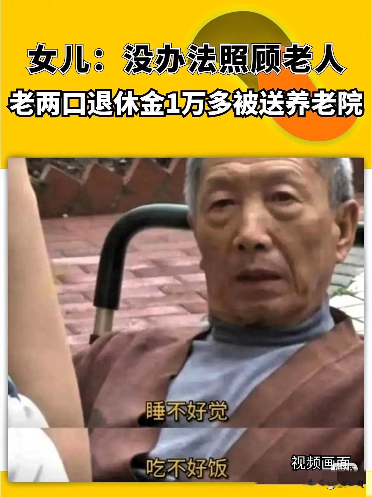 重庆,老两口后悔了! 老两口每月12000元的养老金, 被独生女儿送到养老院。88岁 的老父亲坐在轮椅上说:“在养老院里很不自由,很不习惯,睡不好觉,吃不好饭,所以我们不愿意住。” 10月8日,重庆电视台报道。 老两口都有不菲的退休金,加上一辈子的积蓄,原本以为能有个幸福的晚年,哪知道最后住进养老院。 老两口把一辈子的积蓄都给了独生女儿,养儿防老,是国人的传统想法,钱早晚都是孩子的,不如早点给了他们,省得以后麻烦。 哪知前脚把积蓄给了女儿,后脚就被女儿送进养老院。 老人从熟悉的家里来到陌生的地方,吃住睡都不舒服,央求女儿把他们接回家,女儿以要上班为由拒绝了父母的请求。 老两口岁数大了,都有病。老父亲腿脚不利索,老伴得了阿尔茨海默症。 风烛残年的生活被女儿打包进养老院,女儿倒是落了个清静,老人只想回家。 老人是不是后悔把积蓄都给女儿了。原本想着享受天伦之乐,最后落了个形单影只。 有人说,老父亲已经88岁了,那女儿也是奔6的人了,还有什么班要上。 而且两位老人的退休金也不算低,女儿在家照顾,就当上班,不也挺好吗? 也有可能女儿身体不好,照顾两个老人有些吃力,便想着把老人送进养老院,有专业人员照顾,可能更好吧。 女儿做这些事的时候,应该和父母商量,如果老人更愿意在家,请个保姆也可以吧。 无论是送养老院还是请保姆,都不如自己的女儿照顾方便。 可人老了,也不得不面对这样的现实,子女没空照顾,自己身体衰老无力,如果再有病,真是雪上加霜,只得听从儿女安排。 视频中这个女儿也应反省自己,既然自己没空照顾,就不要拿老人的钱,让老人用积蓄和养老金雇保姆在家照顾,女儿安心上班,也是两全其美的事情。 坚持把老人送到养老院,老人不适应又难过,想想都心疼! 独生女儿养老 悲伤的养老故事 独生女养老 独生养老 重庆养老