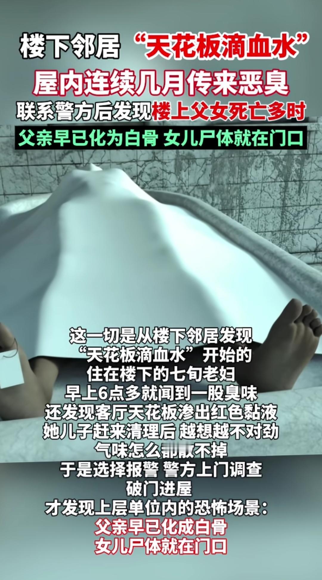 新加坡父女两人离奇死亡,发现时老人已经在卧室化为白骨,女儿死在了门口。 父女二人住在新加坡盛港东大道324D座,还是楼下邻居发现自家天花板滴血水报警,警方立即展开调查,发现楼上房门紧锁半天无人应答而且散发着恶臭,于是破门而入,才发现2人已经死亡多日,目前警方正在调查中。