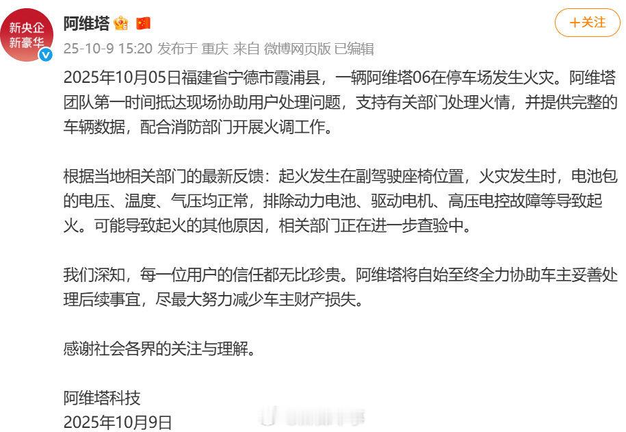 【阿维塔官方回应起火事件,排除电池起火原因】10月9日,发布声明:2025年10