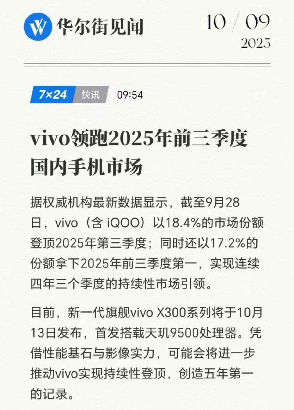 vivo领跑2025年前三季度国内手机市场实现连续四年三个季度的持续性市场引流