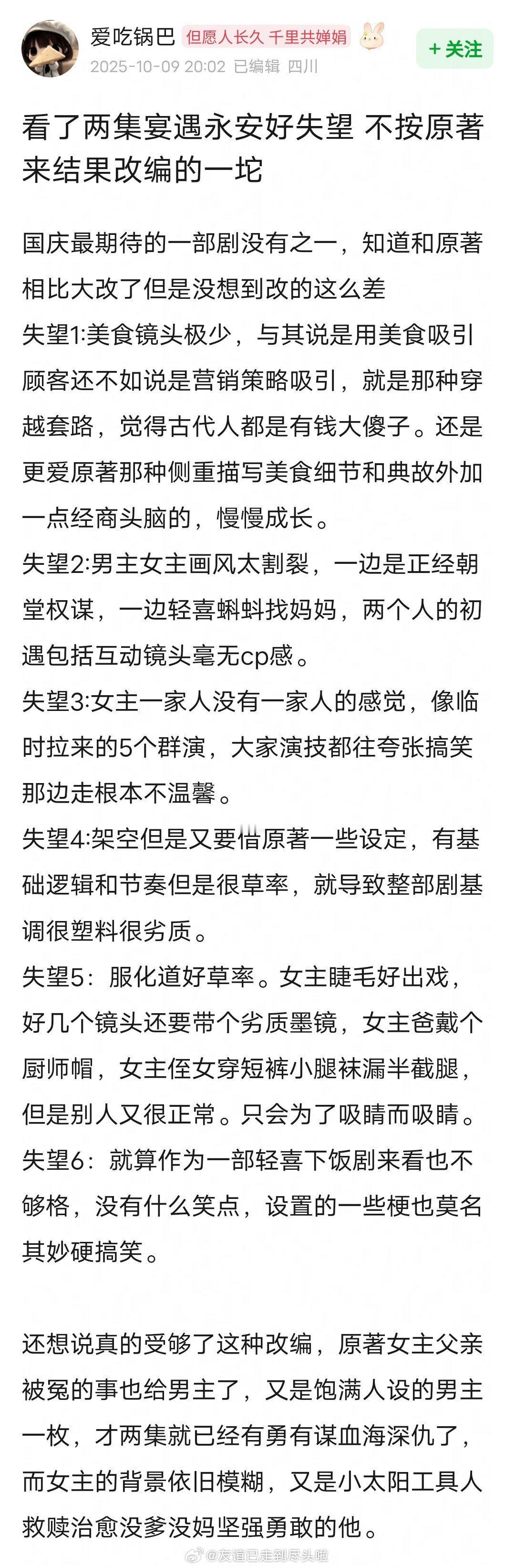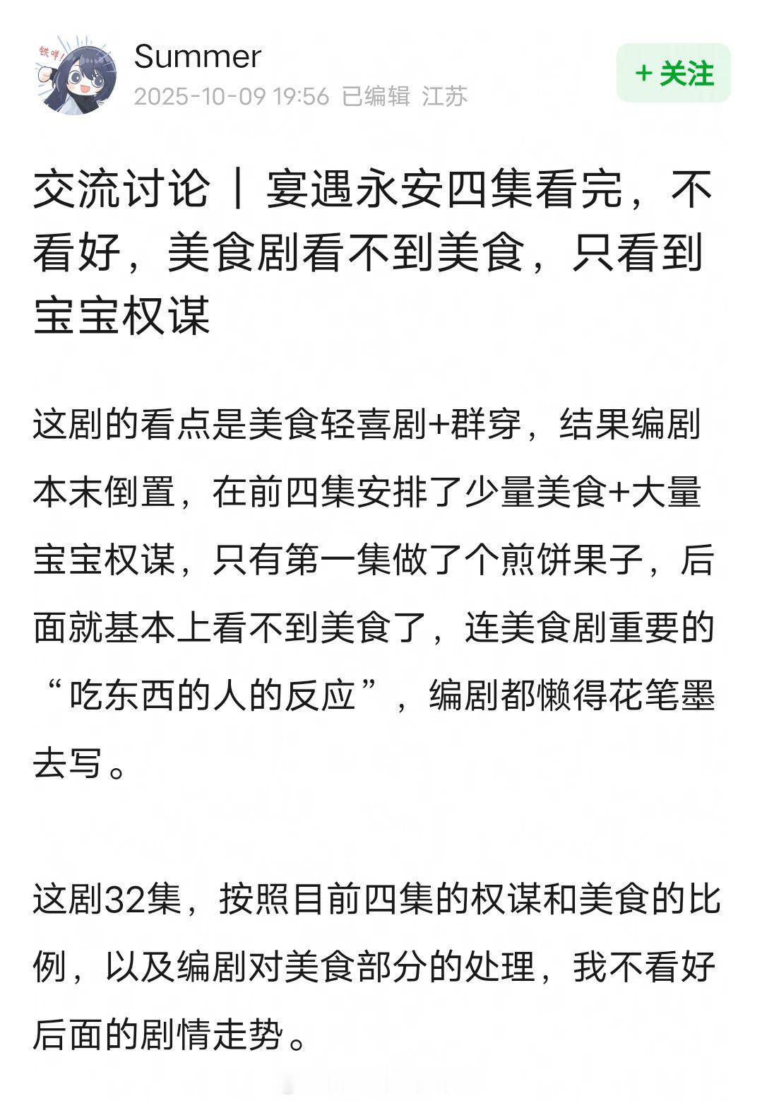 原著是晋江美食文top,这剧的看点是美食轻喜剧+群穿,结果编剧本末倒置,分不清主次。