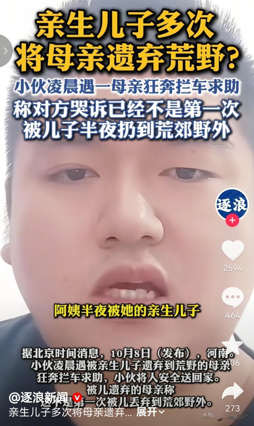 先告诉我年轻的时候有没有干过对不起自己小孩的事情,这几年奇葩原生家庭看太多了,完整瓜没出来之前,我是不会轻易站任何一方。 @阿晨: 从法律上遗弃确实是刑事犯罪,叫做遗弃罪,但不清楚儿子为什么要把他母亲遗在野外?不清楚母亲在家里面的究竟是一个什么样的表现,如果说有老人在家里面天天闹事儿,又不去养老院的话,在一定程度上对他儿子还是挺理解的。但也不能排除儿子,有可能确实是一个电视剧中的白眼狼… 原生家庭偏见 追究父母遗弃罪