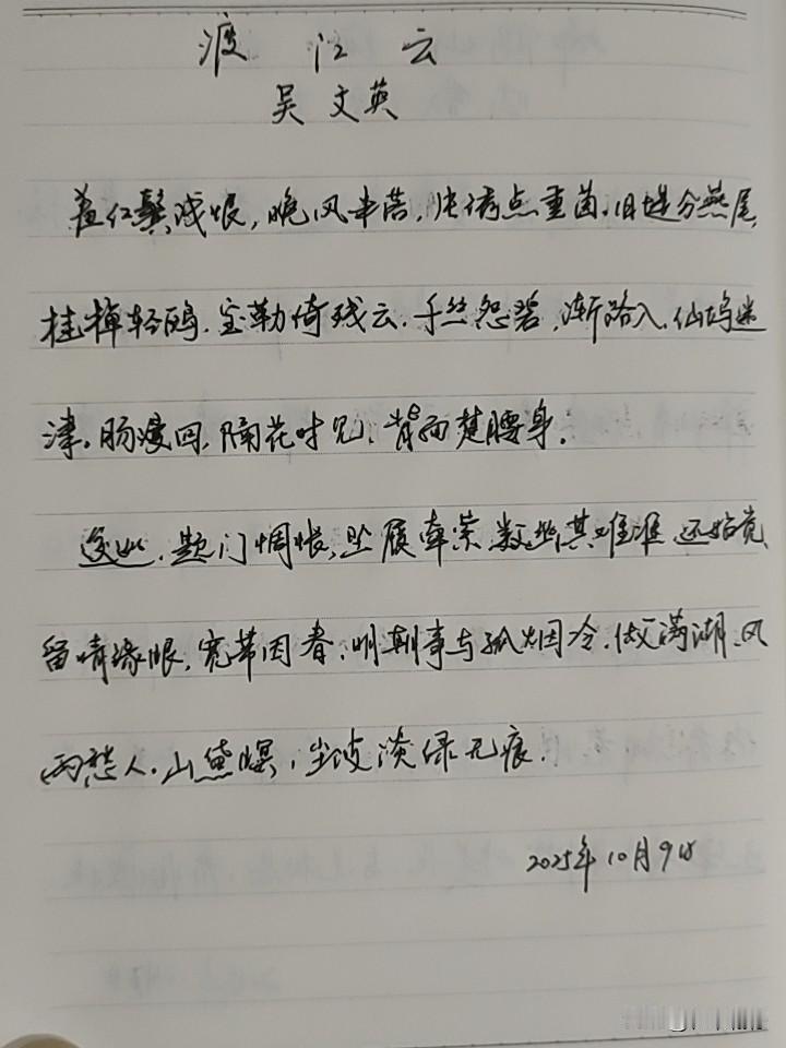 抄书第 967天(2025年10月9日) 静心✔ 戒浮躁,一笔一划。 今天继续抄《唐诗宋词三百首》之《渡江云三犯·西湖清明》,这是宋代词人的吴文英作品。宋词三百首历来与唐诗并称双绝,都代表一代文学之盛。 词主要是写西湖访情人不遇的惆怅。抒发了作者对亡妾的深切悼念之情。抄书古诗词 抄抄书 练练字 静静心