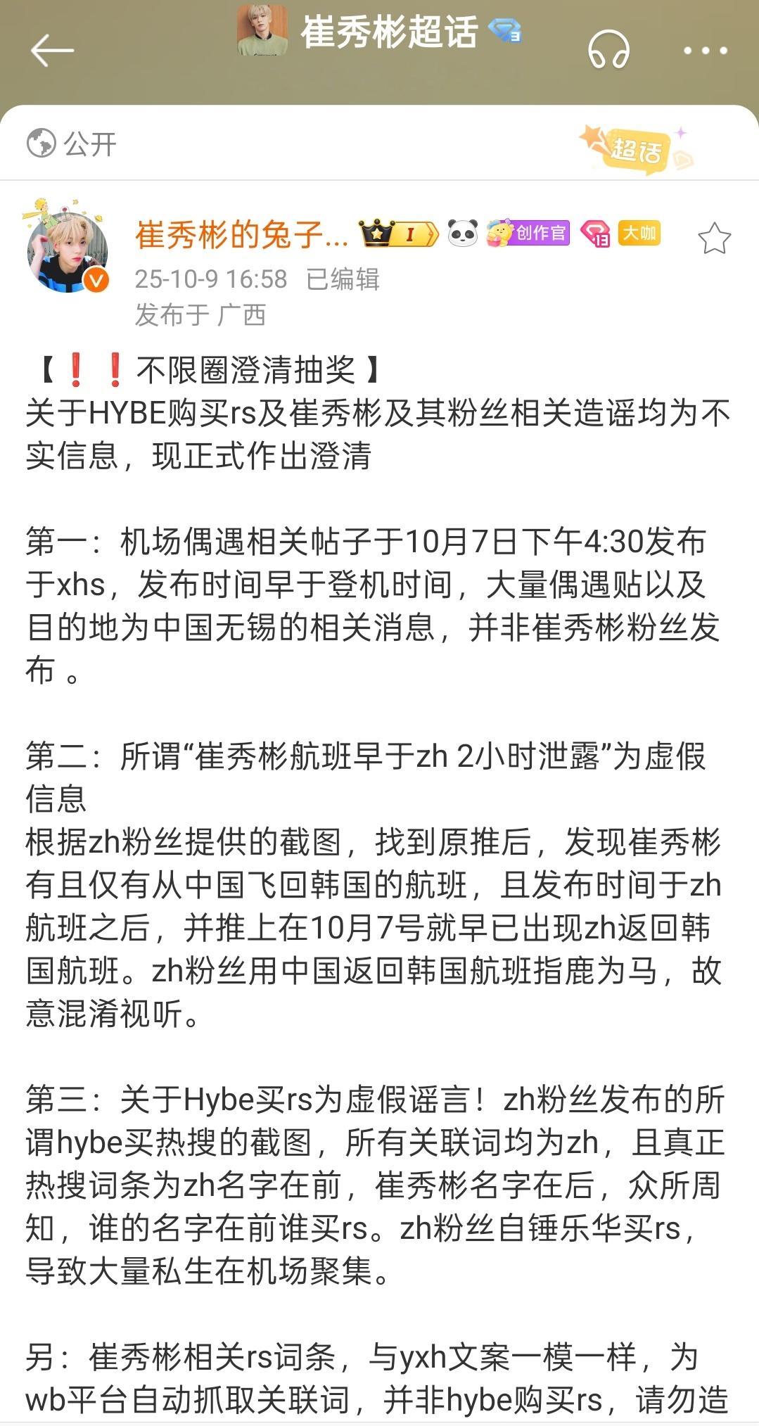 关于HYBE购买rs及崔秀彬及其粉丝相关造谣均为不实信息,现正式作出澄清