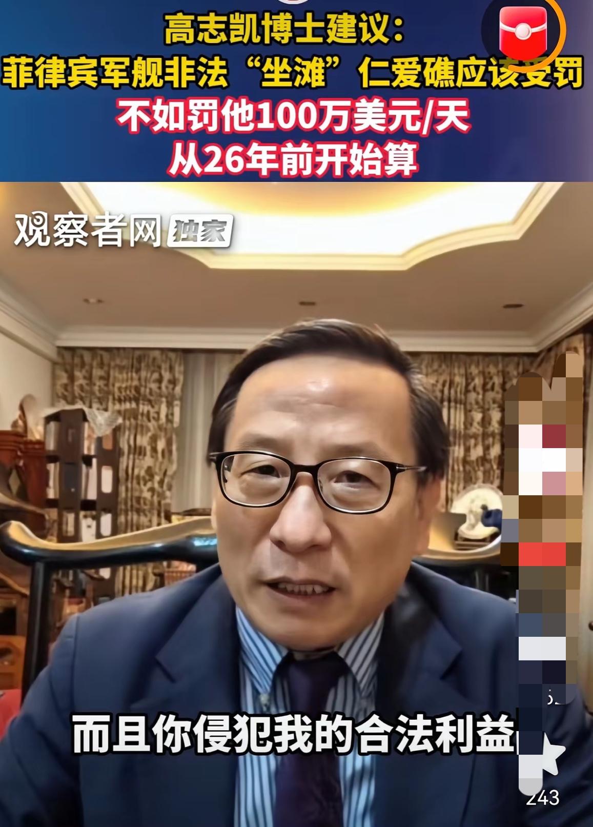 这个主意太绝了!罚款菲律宾坐滩船只100万美元/天! 就在刚刚,著名学者高志凯教授建议:中国应该对菲律宾坐滩仁爱礁船只罚款100万美元每天,不是从今天开始,而从26年前算起。 有网友帮忙算了一下,从26年前菲律宾破船坐滩仁爱礁那一天开始算罚款,截止到今日,100×365×26=949000(万)。近95亿美金。不算滞纳金。人民币结算的话,可以优惠一点,大概665亿人民币。 谁都知道,菲律宾1999年把那艘“马德雷山号”开去仁爱礁时,嘴上说“船底漏水修不好”,实际上打的是啥算盘?无非是抱着“先占了再说”的无赖心思——想着把破船往礁盘上一搁,日子久了,就能把中国的固有领土,偷偷改成自己的“囊中之物”。这一搁就是26年,期间还总趁人不注意往船上运建材,试图把破船修成“永久据点”,算盘打得全世界都听见了。 高教授这建议妙就妙在“不按常理出牌”,没跟菲律宾纠结“船能不能修”“能不能运东西”,直接从“非法占据”的根儿上算账。100万美元一天,看着是笔巨款,可真正的杀伤力不在数字,在“从26年前算起”这七个字。这等于是明明白白告诉菲律宾:你以为非法占着别人的地盘,时间久了就能一笔勾销?门儿都没有!过去26年的账,现在照样能跟你算清楚,以后只要这破船还在礁上,每天都得记着这笔“非法占地费”。 更关键的是,这建议站得住法理的硬气。《联合国海洋法公约》菲律宾也是签了字的,公约里明明白白写着,“坐滩”这种故意滞留的行为,根本不算“实际控制”,反而违反了“不侵犯他国领土主权”的基本原则。高教授提罚款,本质上是用菲律宾自己认可的规则,戳穿它的虚伪——你不是总拿“国际法”当幌子吗?那咱就按规矩来,算算你非法占据别人领土,该掏多少代价。 有人可能会问,这近95亿美金,菲律宾能愿意给吗?其实这根本不是重点。中国从来没指望靠罚款“创收”,而是要通过这种方式,把菲律宾的非法行为“摆到台面上来”。让国际社会都看清楚:不是中国“咄咄逼人”,是菲律宾先耍无赖占着别人的地方;不是中国“故意挑事”,是我们在依法维护自己的主权,连算账都算得明明白白、有理有据。 这建议比单纯的口头抗议有力多了。过去菲律宾总在国际上装“受害者”,现在一提起这26年的“罚款账单”,大家自然会问:“为啥要罚款?”一解释清楚1999年故意坐滩的事儿,菲律宾的“受害者”面具不就掉了?这才是“绝”的地方——不吵不闹,用规则和道理,把对方的无理取闹钉在“非法”的标签上。 各位读者你们怎么看?欢迎在评论区讨论。