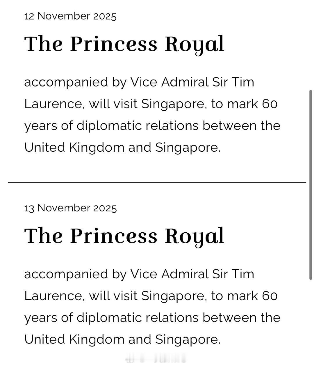 【预告】2025年11月12日至11月13日,安妮长公主和蒂莫西劳伦斯爵士将会访问新加坡,以庆祝英国和新加坡建交6️⃣0️⃣周年🇸🇬
