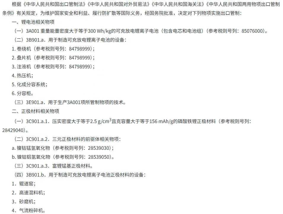 2025年11月8日起,中国将对锂电池、人造石墨负极材料等相关物项实施出口管制。