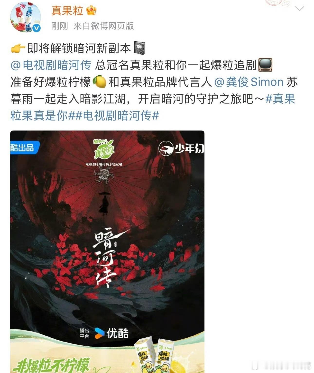 真果粒官宣龚俊暗河传总冠名[点赞]这个龚俊伟大啊[酷]