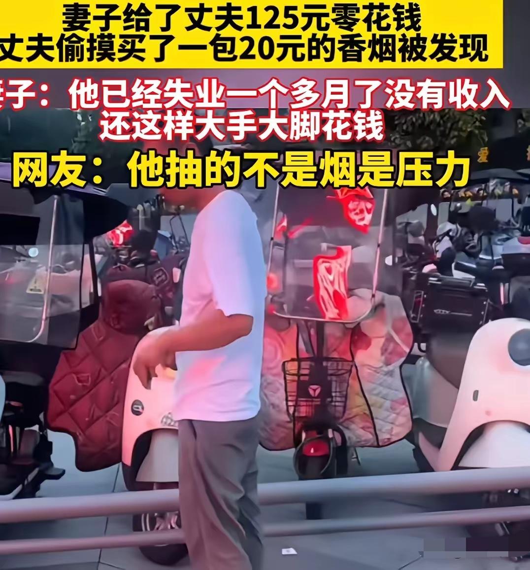 20块钱的一包烟,成了压垮一个中年男人尊严的最后一根稻草。 湖北这位失业男子,揣着妻子给的125元零花钱,偷偷买了包20元的烟,却被当场数落。视频里他手足无措的样子,像极了犯错的孩子,戳中了无数人的心。 这一幕背后,是中年失业者的集体困境:上有老下有小的经济压力,突然断了收入来源的焦虑,以及在家庭话语权中的微妙变化。 妻子的指责并非全无道理,非常时期更需精打细算。但这20元的烟,或许是他在巨大压力下,仅能给自己保留的一点点喘息空间和可怜的体面。 中年人的崩溃,往往就藏在这些无人理解的瞬间里。