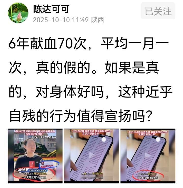 6年献血70次,不科学,不应提倡。献血至少应间隔6个月一次吧,除非紧急状况,且献