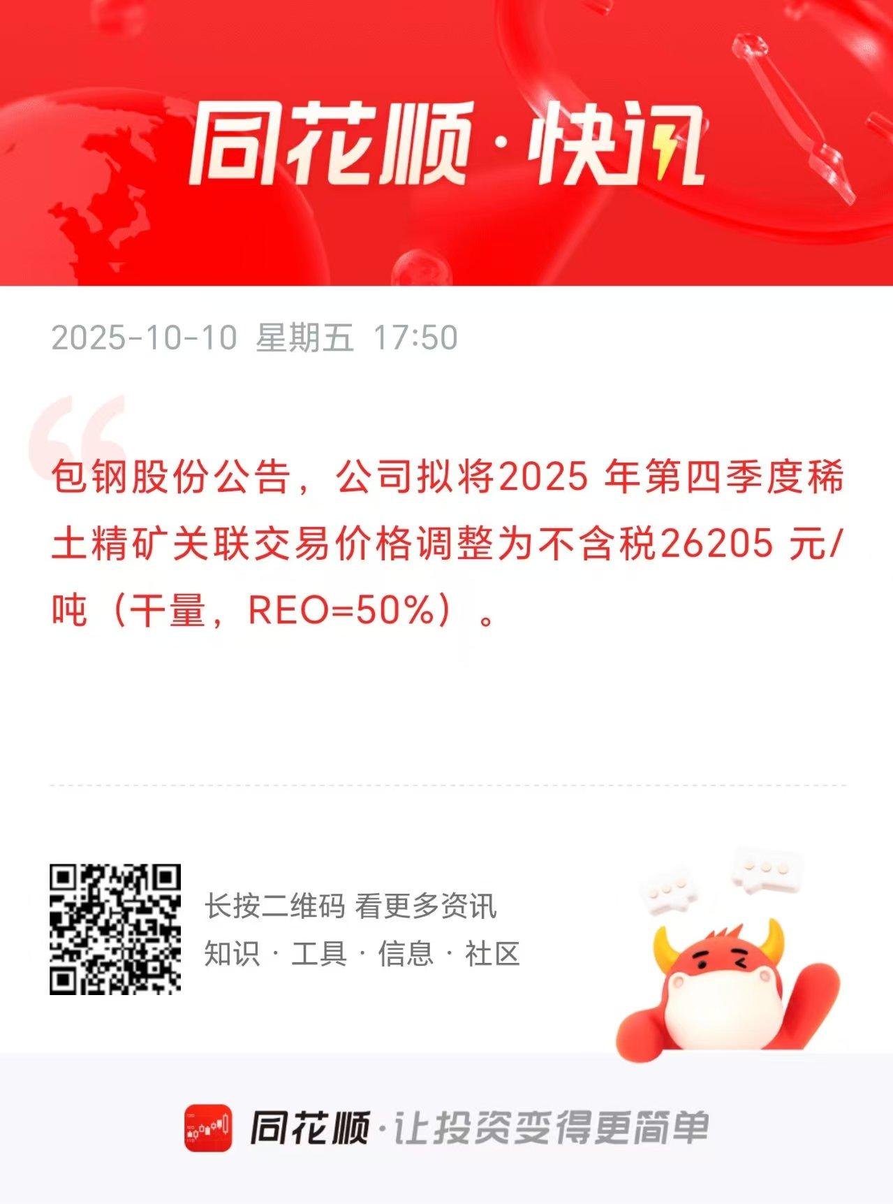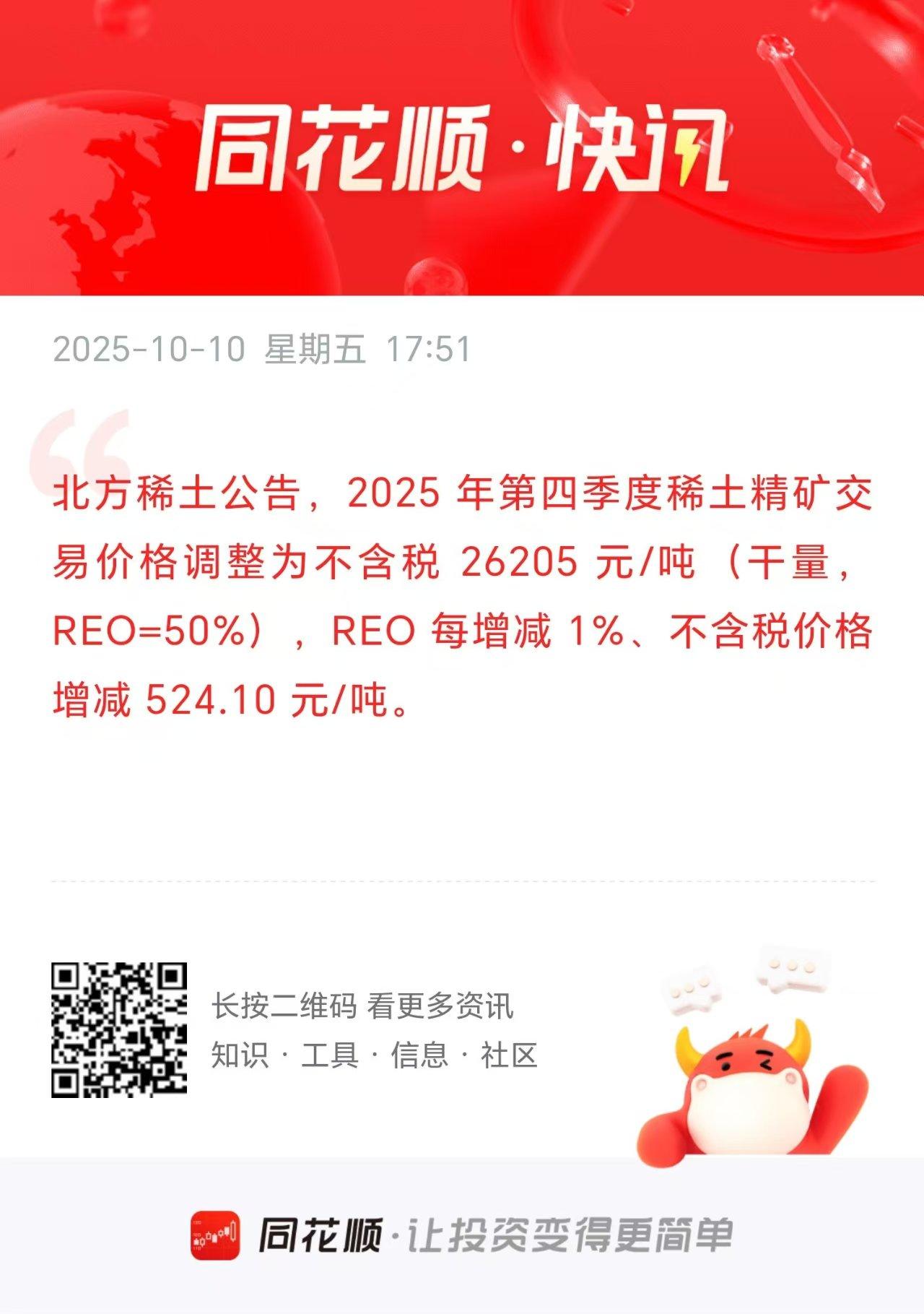 盘后稀土大利好!下周有色金属这一块应该有希望大幅修复了吗? 刚刚北方稀土和包钢股份纷纷发布关于第四季度稀土精矿交易价格调整的公告,内容显示,2025 年第四季度稀土精矿关联交易价格调整为不含税26205 元/吨。 大家看这个消息,是不是对于稀土板块而言是重大利好? 为什么? 因为第三季度稀土精矿关联交易价格才19109元/吨。现在第四季度,稀土精矿关联交易价格直接上调到了26205 元/吨,相当于大幅增涨了37.13%。 稀土精矿关联交易价格大幅提高了37.13%,这不是相当于直接锁定了第四季度的业绩了吗?如果第四季度稀土销量还能增长,则稀土公司的收入必然将大幅增长。 所以北方稀土和包钢股份纷纷上调第四季度稀土精矿关联交易价格,无疑是有望刺激下周一稀土板块的回暖的。 今天不少有色板块个股纷纷大幅回调,原因我想大家都清楚。 现在盘后北方稀土和包钢股份纷纷上调第四季度稀土精矿关联交易价格,无疑是给了有色板块下周一修复的机会。 所以大家也不要因为今天有色板块回调导致账户亏损了而心情不好了,下周一大概率将搞回来了!
