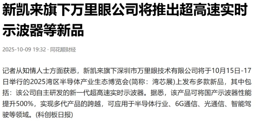 我们欣喜的看到,新凯来不仅填补了我国半导体制造装备的若干空白,在我国高端检测仪器领域也取得突破,推出了新品——超高速实时示波器等。