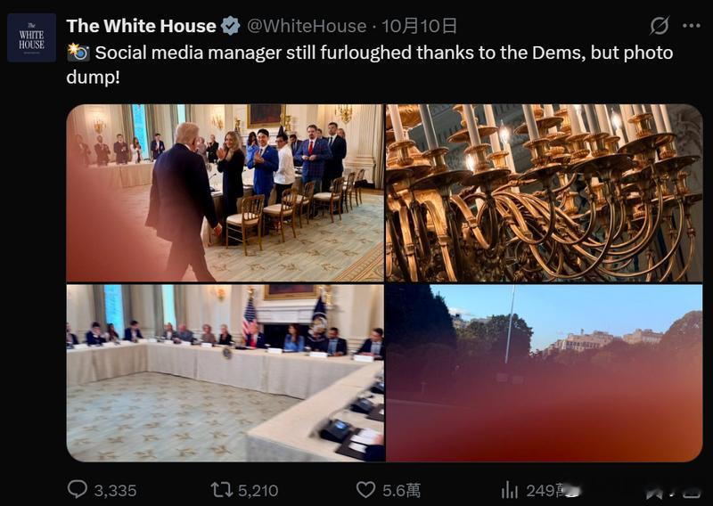 不过,细看白宫的贴文文字可发现,照片其实带有讽刺意味。文案写道:“感谢民主党,让社交媒体经理被迫休假——连照片都废了。”这暗示因预算僵局导致政府停摆,社交媒体团队部分成员被迫放假,照片质量也因此“受牵连”。