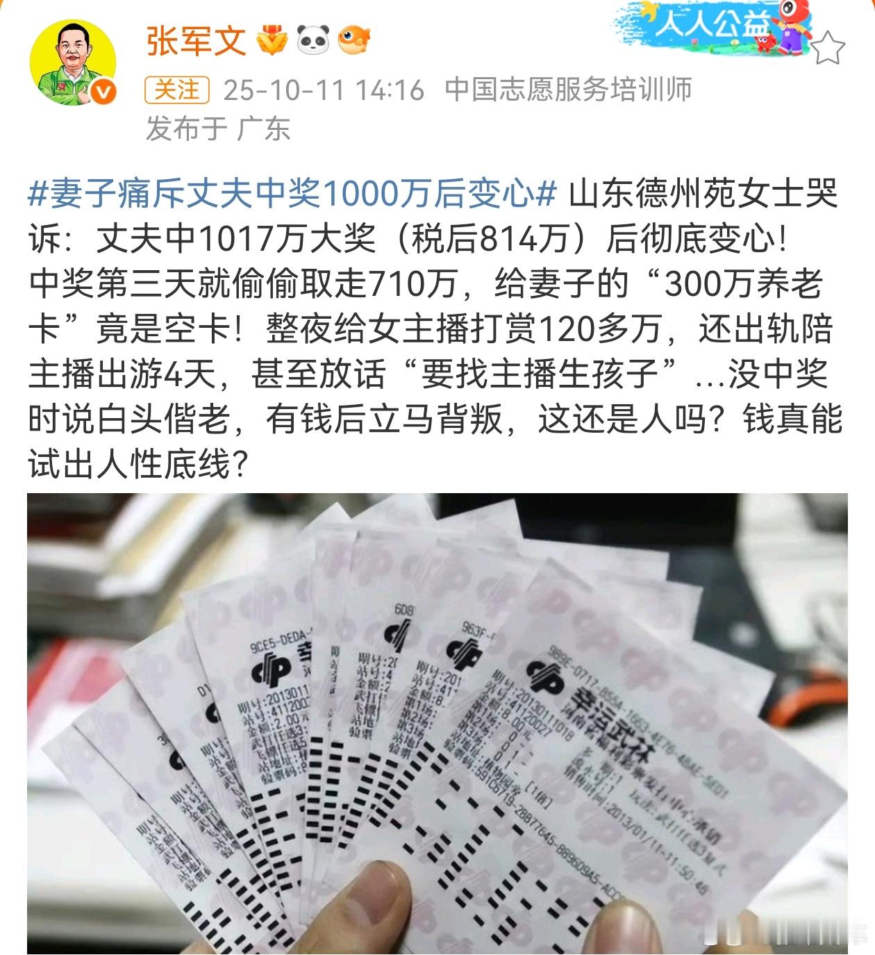 妻子痛斥丈夫中奖1000万后变心 普通人暴富之后,绝大多数都会跌得很惨,妻离子散也是常事