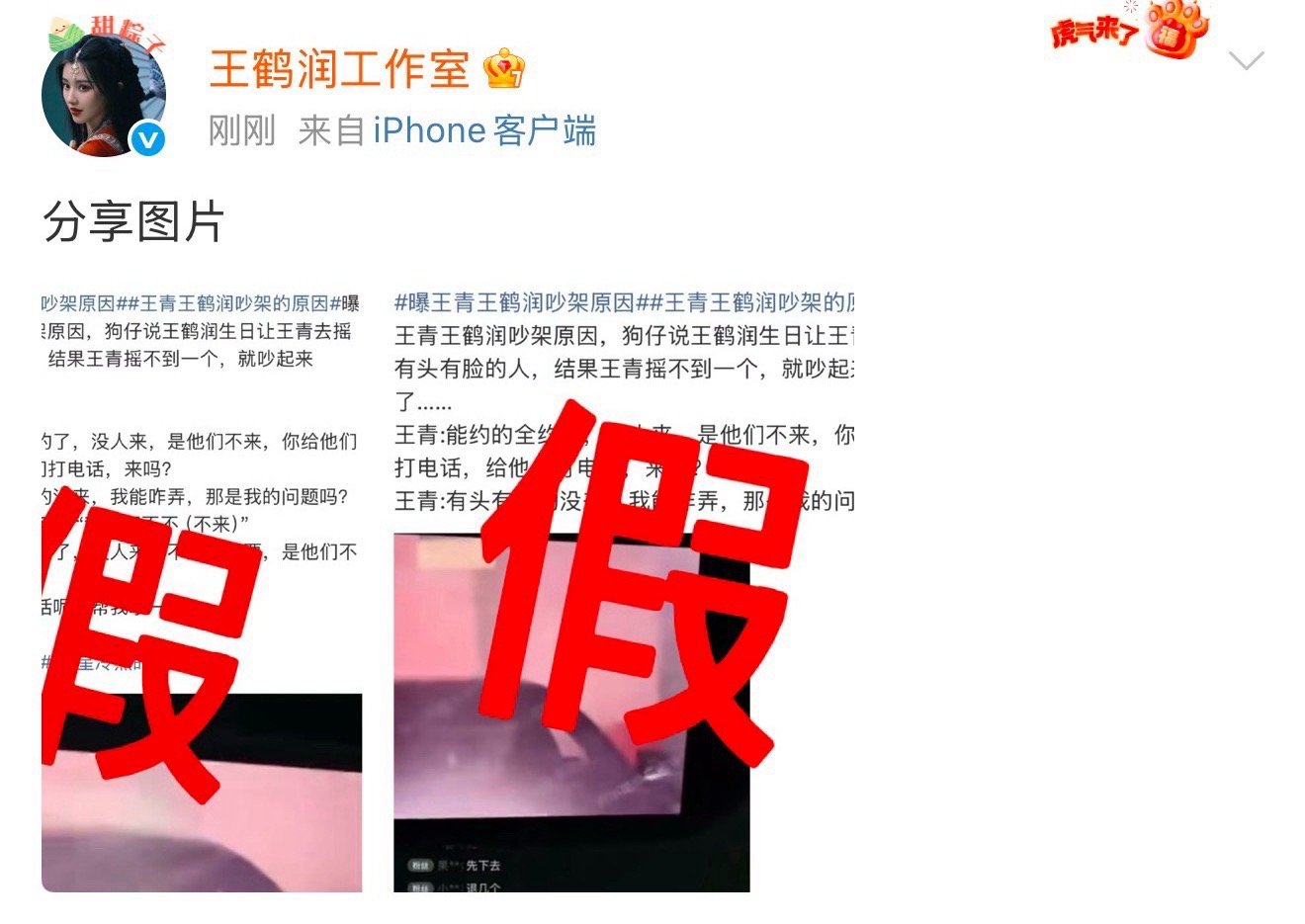 王鹤润工作室辟谣,狗仔爆料的王青王鹤润吵架原因为假。