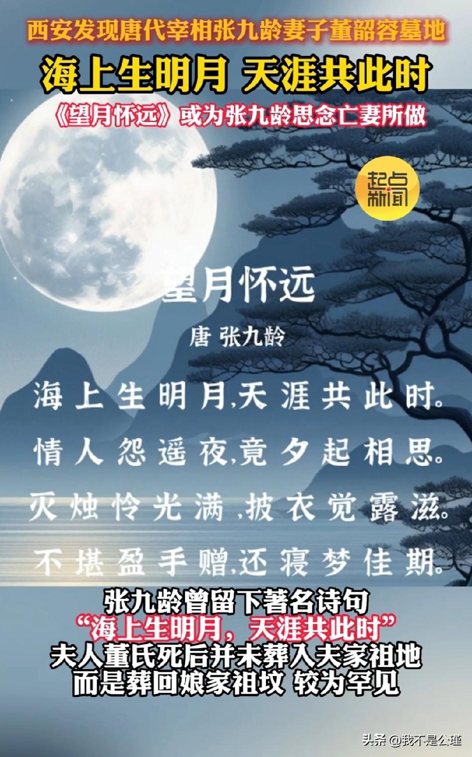 唐朝宰相张九龄和其夫人董韶容百年后天南地北, 一个葬在广东韶关 一个葬在陕西西安 相隔千里之遥 近日,西安发现一处墓葬,结果显示其主人是唐朝宰相张九龄夫人董韶容。 张九龄不光做宰相厉害,他的诗词也是流传千古。 比如那句“海上生明月,天涯共此时”。 这首诗也被解读为对其妻子的思念所作。 巧合的是张九龄的故乡是广东韶关, 而他妻子名字里也有一个韶字。 冥冥之中,缘分自有天意。 张九龄 张九龄墓志 广东 西安 韶关唐墓 陕西 望月怀古 唐朝