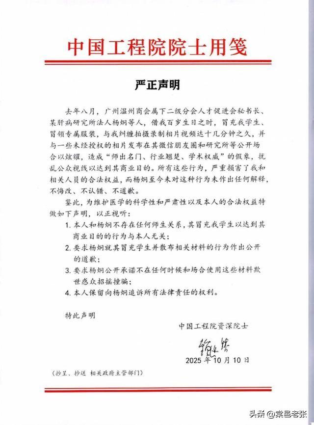 10月11日,钟世镇院士办公室发布声明,此事令人气愤。钟世镇院士是解剖学泰斗、中国临床解剖学创始人,奉献医学事业一生,如今已百岁高龄。在其寿辰庆典这一重要时刻,竟有五人冒名闯入,违规拍摄影像资料并用于不当宣传,行为十分恶劣。 钟院士在医学领域贡献卓越,值得敬重。这些人却为一己之私行事,全然不顾对老人的影响。希望大家尊重前辈,莫再做损人利己之事。