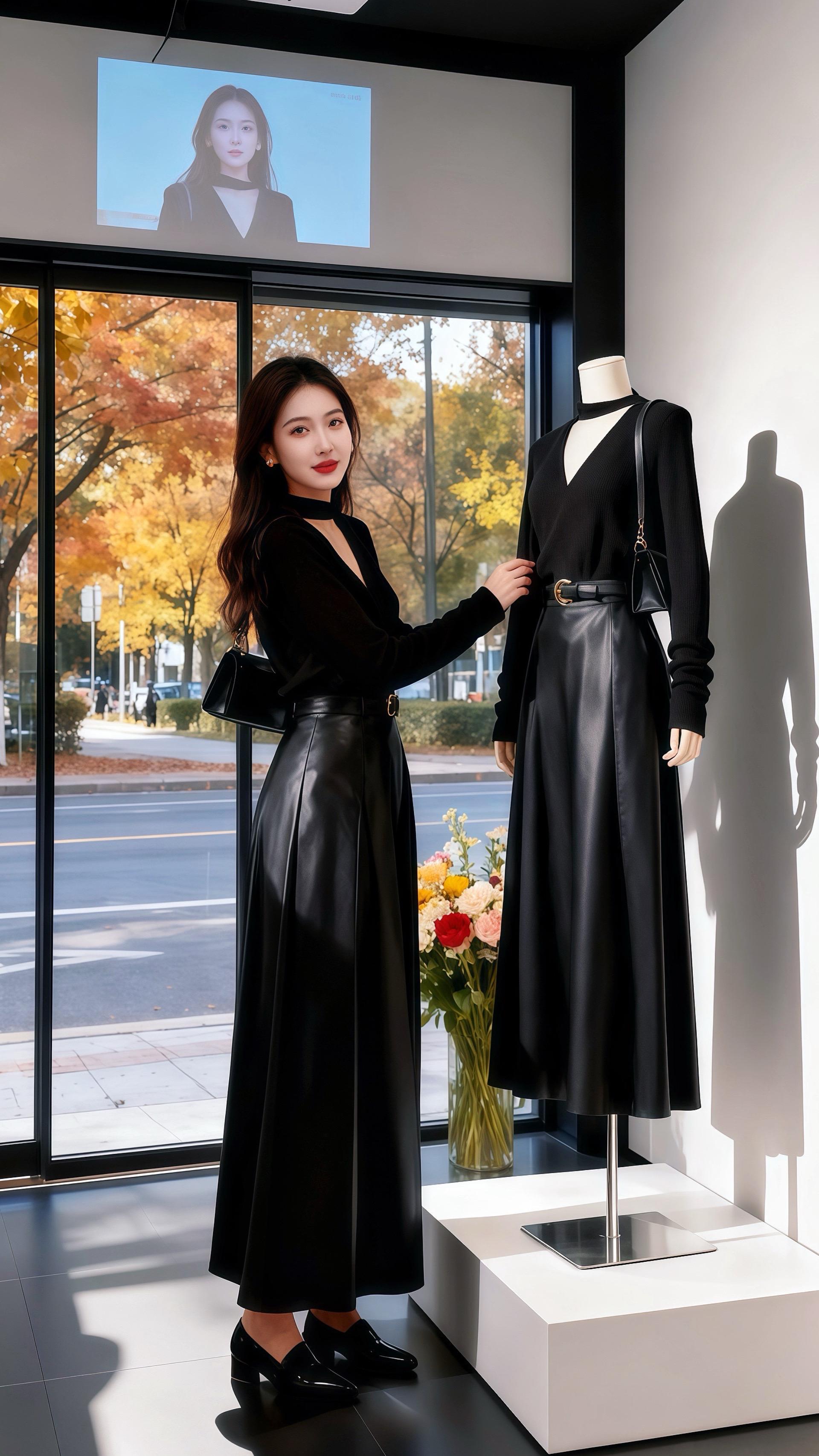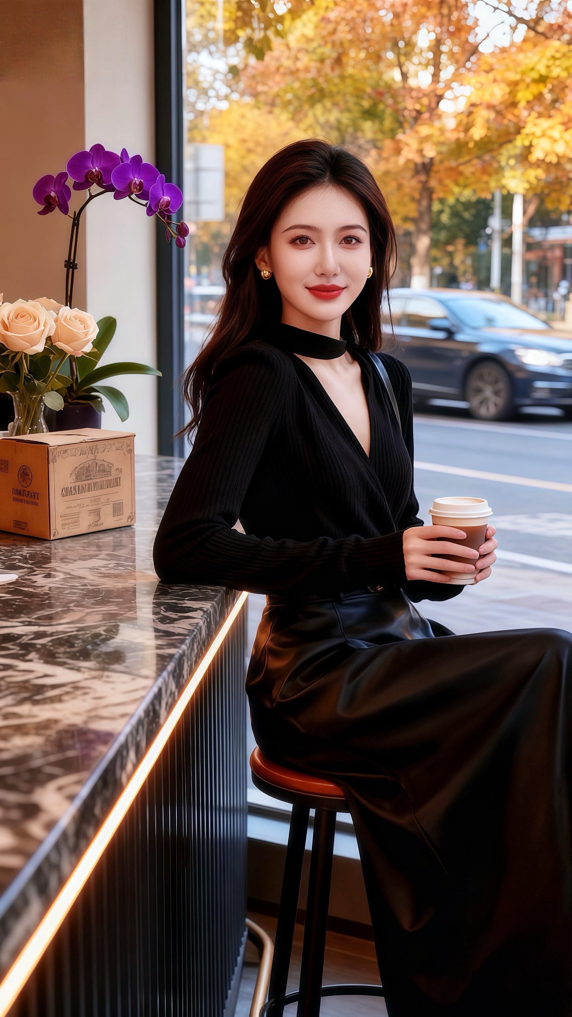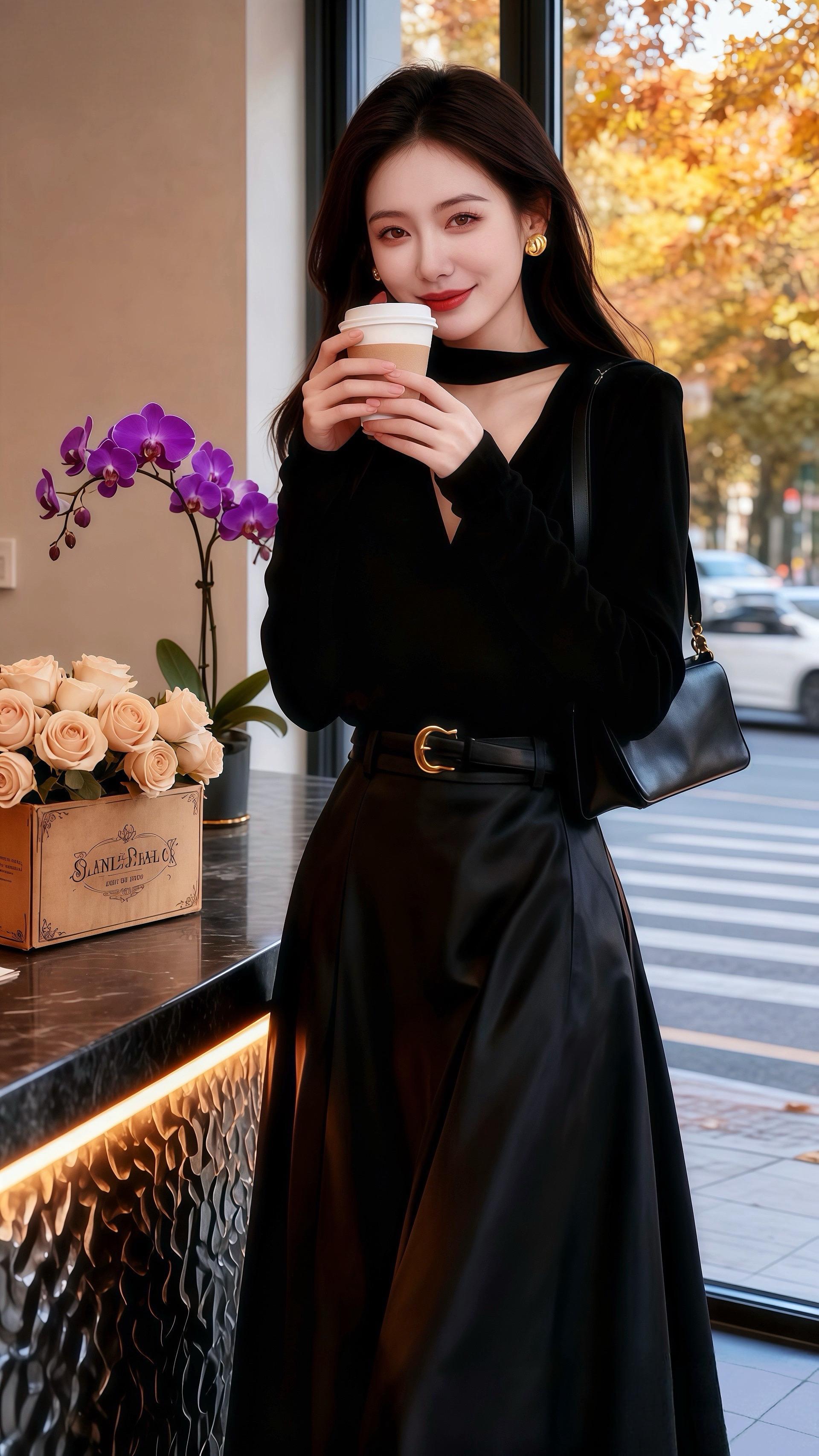 深秋的午后,阳光透过咖啡馆的落地窗,给许妍周身镀上一层暖黄。她穿着那套黑色系穿搭,领口的设计别致又优雅,长发微卷,端着咖啡杯的姿态,像一幅精心构图的画。