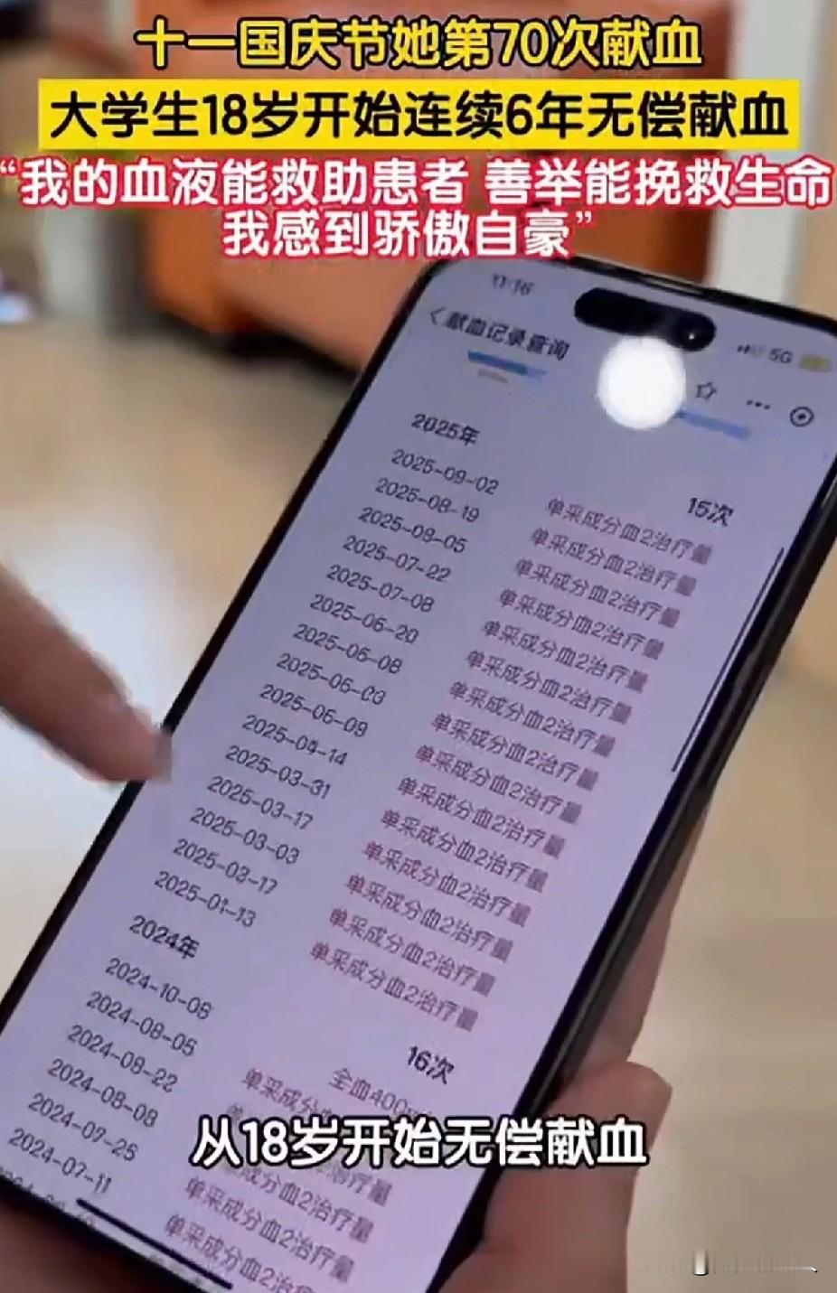 女子分享6年献血70次,却被一些无知的网络黑嘴吐槽,让人寒心 6年献70次血,平均差不多1个月献一次,乍一听是有点违背常识,但献血其实也是有区分的,如分全血、血小板等。 从女子分享的手机献血记录(图1~图2),可以看出来她就是献血小板这类的,一个月献了两次(符合间隔时间14天规定),2025年还没过去她就已经献了15次。 因此可以看出来,这个女子接受采访说的6年献血70次,并不是像一些网友吐槽的那样是编的。 有些网友在触碰到他们的知识盲区的时候,并不是去查验,而是张嘴吐槽嘲讽,这样的行为要不得!