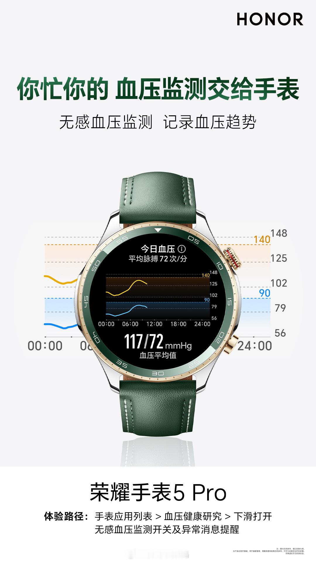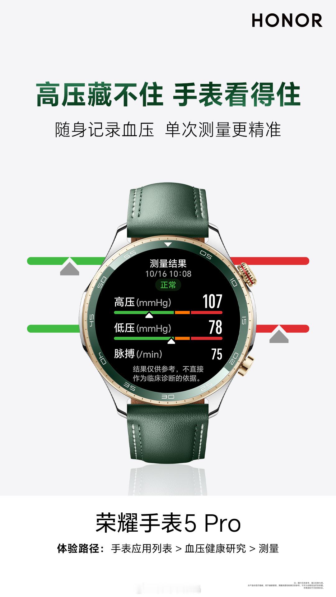 荣耀手表5 Pro,一次校准便可主动无感测量血压,实时出值。方寸间精准测量,开启