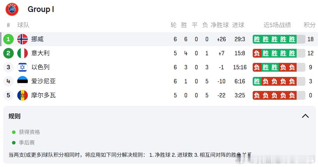 【🇳🇴晋级在望】世预赛欧洲区I组积分榜: