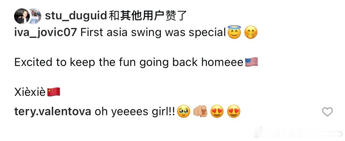 “第一次亚洲赛季很特别😇🫢很兴奋能继续保持乐趣,回家咯,谢谢🇨🇳”瓦伦托娃点赞+评论