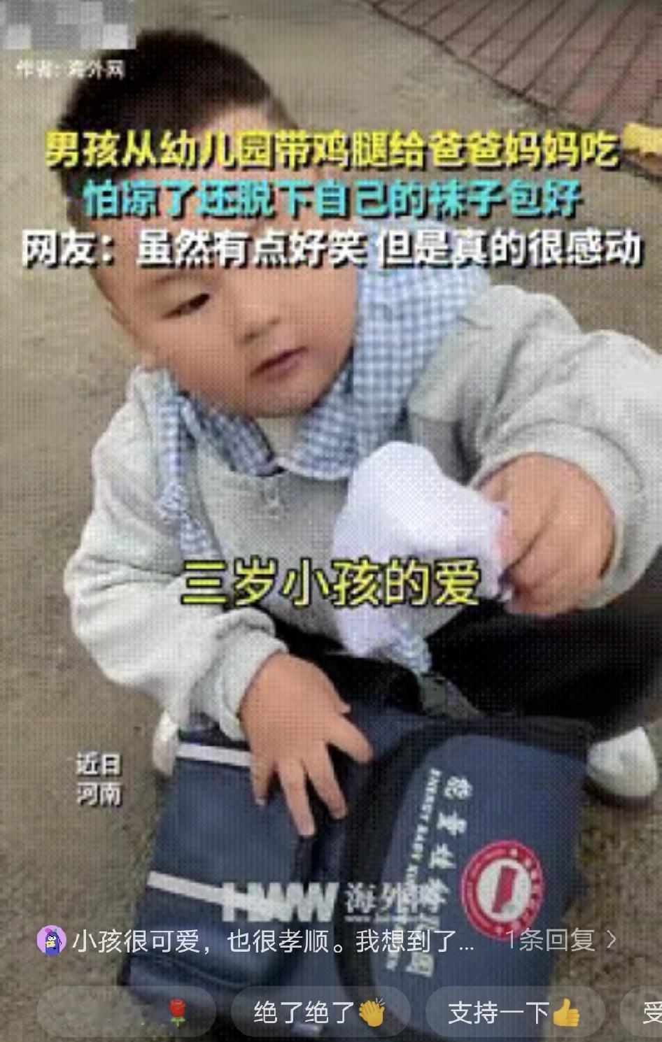 河南3岁娃脱袜子包鸡腿给爸妈,这“臭烘烘”的爱,比任何礼物都戳心! 谁能想到,幼儿园午餐的鸡腿,能让娃动这么多心思——知道爸妈总把好吃的让给他,偷偷藏起来想带回家;怕被老师发现、怕鸡腿凉,居然脱下一只袜子当“保温袋”。全程攥着袜子藏进书包,放学第一时间冲去给爸妈惊喜,自己馋得咽口水还不忘催“给妈妈吃”。 有人觉得袜子不卫生,可在娃眼里,这是能想到的最好办法:既藏得住,又能保暖。这份没被世俗规则框住的纯粹,比任何精心准备的礼物都珍贵。爸妈没嫌弃,反而笑着一起分享,这才是对孩子爱意最好的回应。 你家娃有没有做过这种“有点傻却超暖心”的事?来聊聊呗!