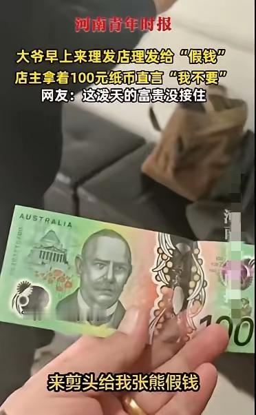 “这下后悔了吧!”10月11日,江苏徐州,一大爷来理发店理发,结账时却给了理发店老板一张红绿相间的“百元大钞”,气得老板直呼大爷是“熊老头子”,事后他才得知大爷给的竟是澳元,价值462元人民币!网友:这泼天的富贵没接住! 徐州这理发店老板,怕是得懊恼好几天!大清早大爷来理发,结账时递过去一张红绿相间的“百元大钞”,老板一摸,滑溜溜像塑料片,再看花纹,觉得花里胡哨的肯定是假钱。 他当场就急了,直呼大爷是“熊老头子”,死活不收这钱,非得让大爷手机支付。大爷没法子,只好把钱收回去,乖乖扫码付了款。结果老板把这事当趣闻发网上,评论区直接给他整破防——那根本不是假钱,是100澳元,换人民币得462块,理个发倒赚三百多的机会,就这么被他亲手推走了! 网友说“赚不到认知以外的钱”,这话真没说错。要是当时老板多问一句“这是啥钱”,或者先留个心眼,也不至于错过这“泼天富贵”。你们说,要是你遇到不认识的外币,第一反应会是拒收,还是先搞清楚再说呢?