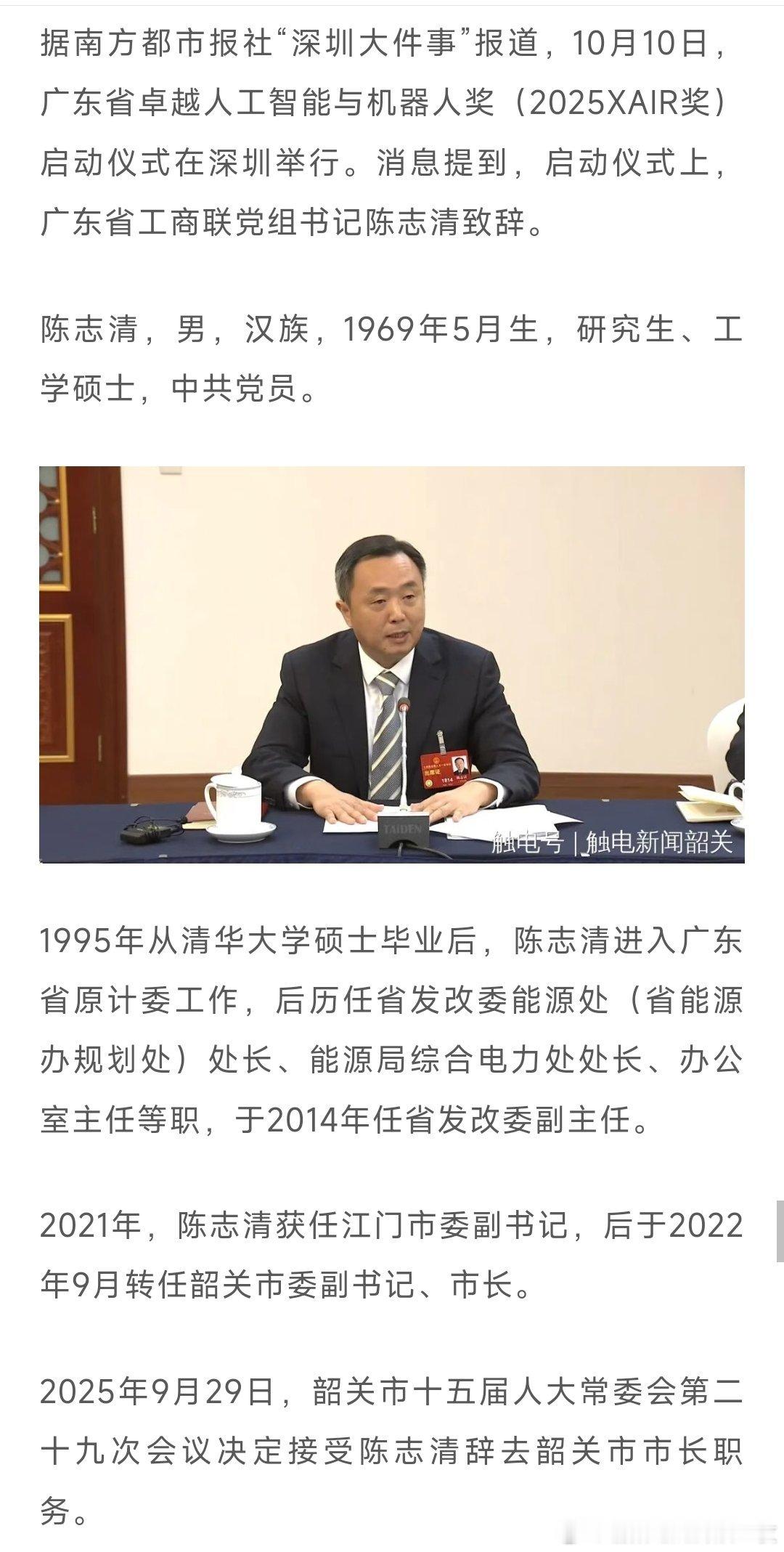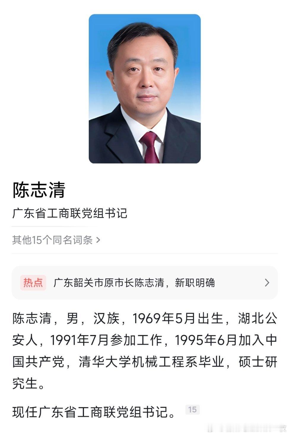 陈志清已任广东省工商联党组书记,此前为韶关市长。热点现场