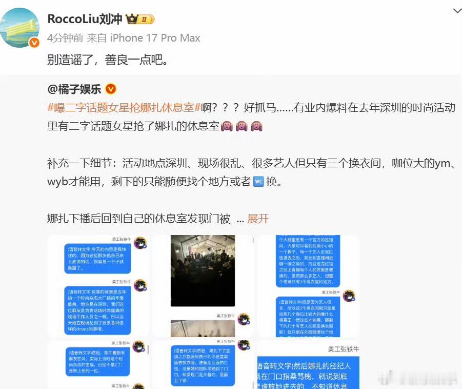 娜扎被抢休息室?经纪人回应拆穿谣言 昨天“二字女星抢娜扎休息室”的瓜突然发酵,不少人都在猜到底是谁这么大胆。结果今天娜扎经纪人直接下场回应,一句话就把事儿说透了。 他说活动后台本来就有很多随机情况,大家互相帮忙是常事,哪有什么固定的主角休息室,全都是机动安排的,还特意叮嘱别恶意编女生之间的故事,让大家散了。另一边,刘冲也跟着发声,就四个字“别造谣了,善良一点吧”,态度特别明确。 其实这种后台小风波,本来就是捕风捉影,还好双方及时回应,没让谣言越传越歪,也算是给这场闹剧画上了句号。