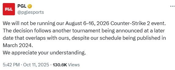 此改动也让PGL随即取消了原定于2026年8月举办的赛事,并赛事主办方在X平台发文暗讽利雅得赛事:"尽管我方赛程早在2024年3月已公布,但后续仍有其他赛事主办方宣布与我们的赛程撞期。