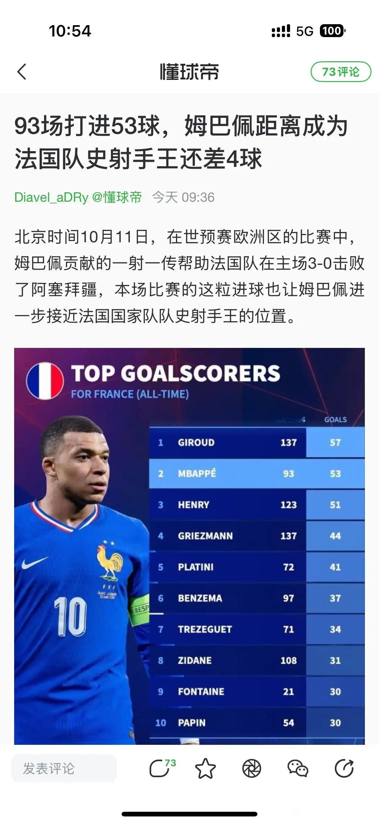 姆巴佩年纪轻轻,就要成为法国历史射手王啦! 吉鲁57球,他已经53球,只差4球。 按照最近状态,2场比赛就能反超。 姆巴佩今年也才27岁,明年28岁再拿一次世界杯冠军,那就封神啦,比齐达内地位高。 特别是数据,前无古人后无来者。[赞]