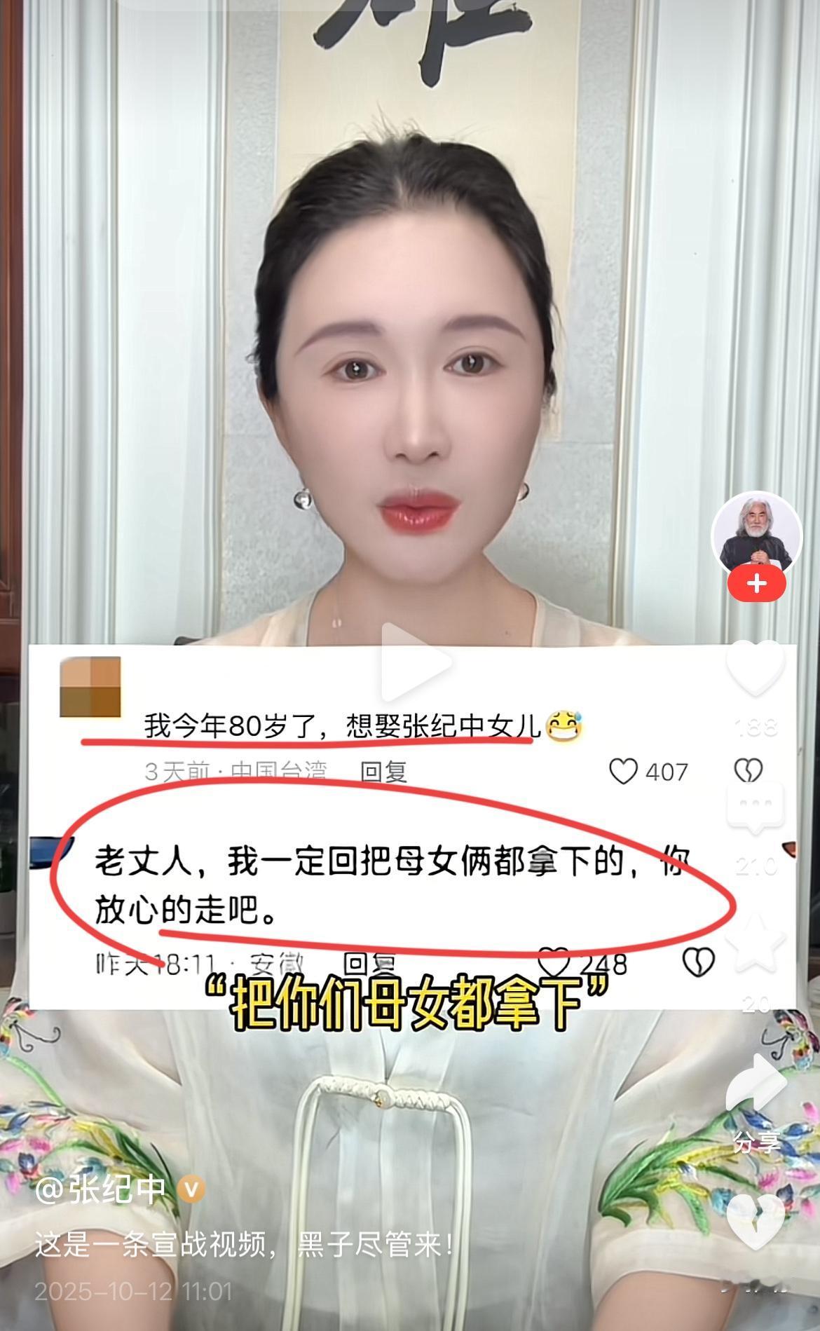 著名大胡子张纪中导演的娇妻终于爆发了!! 她特意录制视频怒怼网友调侃和网暴他们一家人; 视频中,杜女士破防了,说这些网友都是生活不如意的人; 最开始的那些调侃,他和张导都视而不见,毕竟那些生活不如意的网友也不容易; 他们权当是成为一个发泄窗口。 这次,他们就忍受不了,因为这帮loser开始攻击他们一岁生日的爱女了。 这个庆祝一岁生日的视频,播放量过千万,目前已经删除。 杜女士称,攻击他们可以,但攻击她女儿绝对不允许; 张导是名人,名导,但她不是; 她是一个普通的母亲,你们敢攻击他们的女儿,她就要把你送上法庭。 杜女士还表示,已经收集和固定证据了。 杜女士还透露,这个账号的它自己运营,张导是配合拍摄; 不具体负责账号的运营,张导事业太忙了,评论都没有时间看。 我是在头条看到这个视频的,抖音的播放已经好几百万; 评论也有几万条了,随便看了一下评论还是那种风格。 这些网友就真不不怕被告上法庭么? 有人说,你既然要出来获取流量,直播带货,享受流量红利,就要承受流量带来的反噬。 欲戴王冠,必承其重啊。 不知道咋想的! 网友说,如果不想接受网友的评论,何必每天出来各种晒恩爱,搞流量; 还开启了直播带货,难道每个人都要说好才行,说不好你们就要告网友? 对于此事,你有什么看法呢?