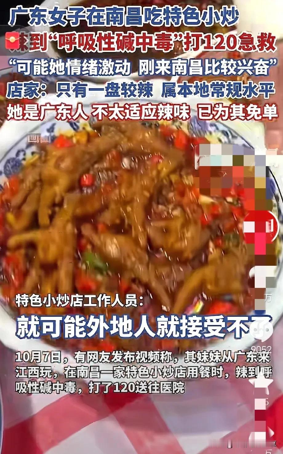 这下好了, 不止南昌知道了,全国都知道了, 事实证明,广东人是真的吃不了辣! 10月5日,广东一女子来江西南昌旅游,可能情绪比较激动,刚来南昌比较兴奋,非得体验一下南昌特色小炒,结果把自己干进医院了!而病因就是被辣到“呼吸性碱中毒”! 事后该店为表示,该女子只点了一盘辣的,那也是当地的正常标准,其他都是不辣的,应该是她吃的比较清淡吧,并已经为该女子免单! 一方水土养一方人,每个地方都有每个地方的饮食文化,广东饮食清淡是全国出名的,而江西吃辣也是闻名全国的! 出来旅游,就是为了看美景尝美食体验当地不一样的风土人情!而品尝当地特色美食是了解当地文化最快的方式,但切记,要量力而行! 大家觉得呢?广东人吃辣梗