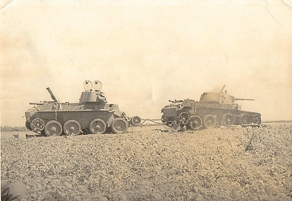 两辆苏军BT-7M快速坦克在试图撤离战场时被击毁,摄于1941年。 显然前面的一辆坦克试图将另一辆受损车牵引撤退时遭到重型反坦克火力射击而双双被毁(炮塔上可见明显的弹孔),坦克侧面是一名牺牲乘员的遗体,身上覆盖着防水布。