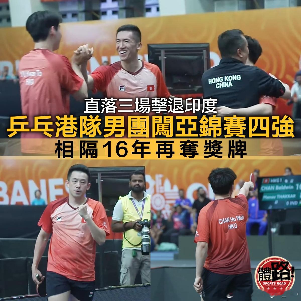 「第28届亚洲乒乓球团体锦标赛」周六(11日)起一连5日于印度布巴内什瓦尔举行,被列为男子组6号种子的港队在周日(12日)出战8强赛,最终在黄镇廷先拔头筹、陈颢桦及林兆恒分途险胜3:2下直落三场击败3/4号种子的东道主晋级4强。由于赛事不设铜牌战,今场胜仗为港队锁定一面奖牌,将是男子队继2009年后再登颁奖台。女子港队则于8强场数1:3不敌韩国,未能连续4届夺牌。