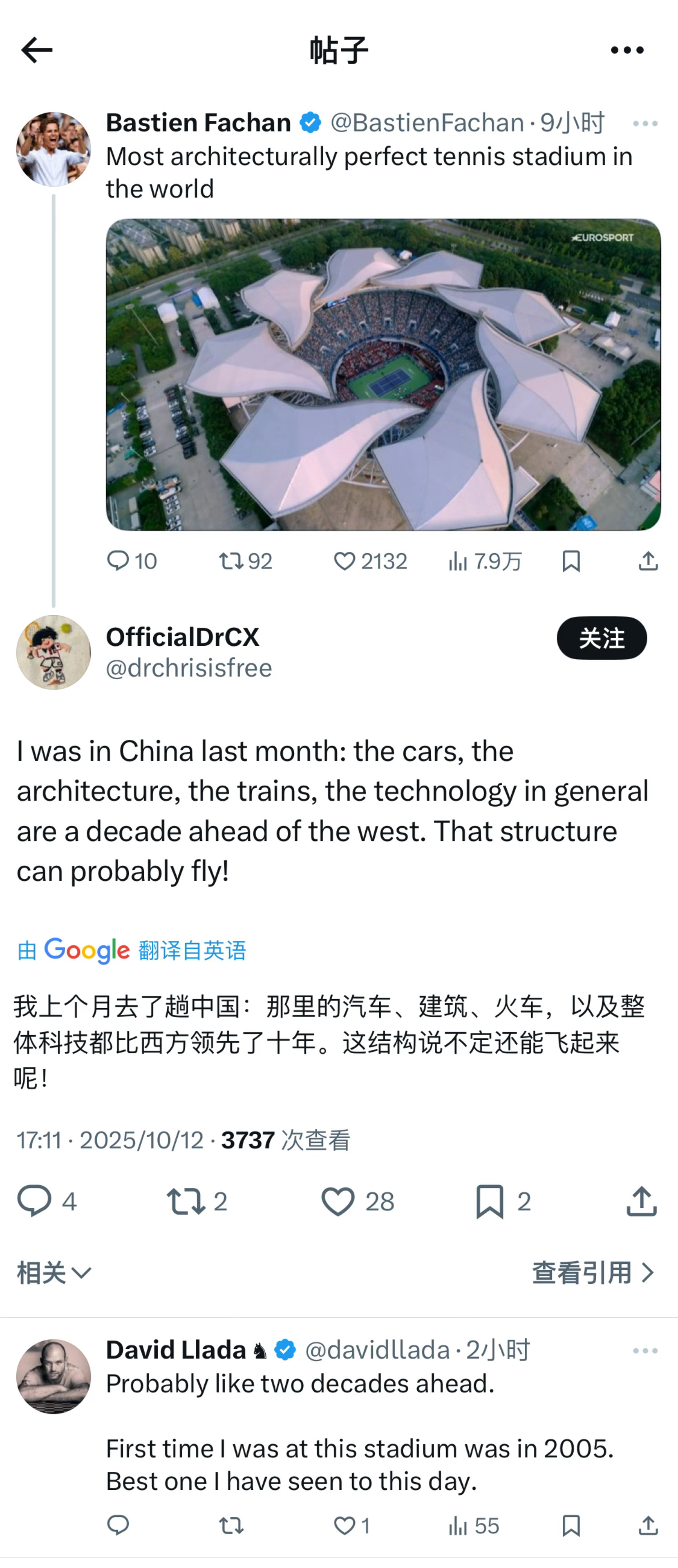 底下网友就开始热烈讨论,一人说:“我上个月在中国,那里的汽车、建筑、火车,各种科技都领先西方十年。”然后另一个网友回复:“也许领先了二十年吧。我第一次见这座球场是2005年,到现在仍是我见过最好的。”