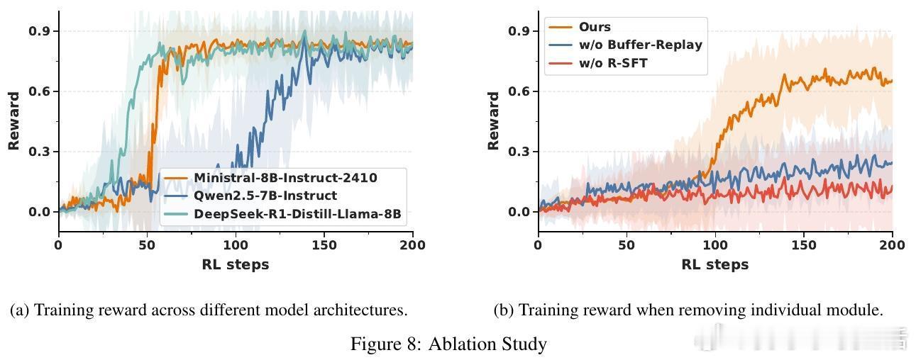 - 训练机制对不同模型架构均表现稳定,且引入缓冲重放机制有效缓解奖励稀疏问题,提升训练效率。